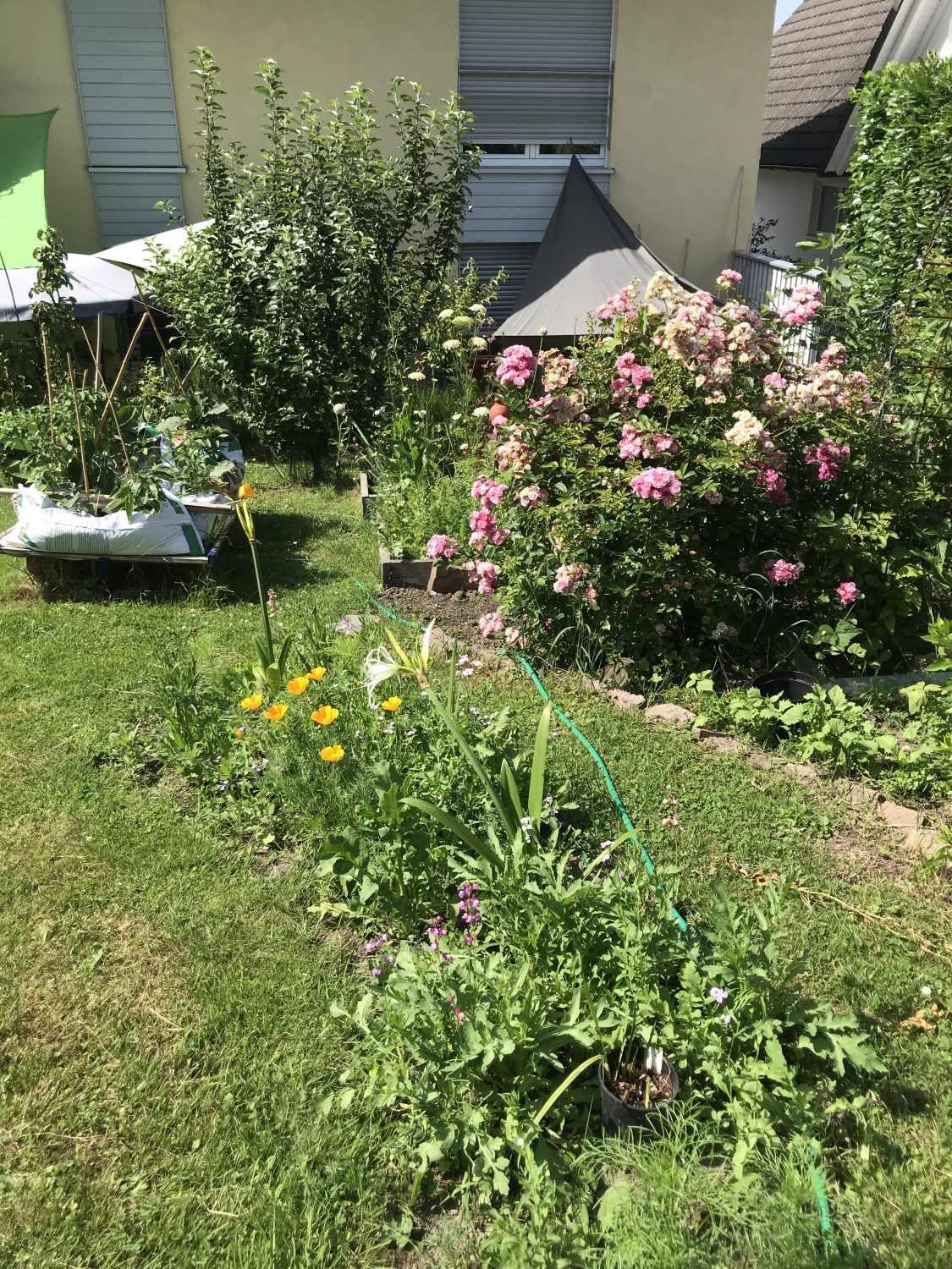 Jedes Jahr muss ich feststellen, dass die blühenden Flächen in unserem Garten eindeutig unter repräsentiert sind. Wir brauchen den Rasen für die Kinder, damit sie Platz zum Toben haben. Durch den abschüssigen Hang ist er auch eine sehr beliebte Rennstrecke für die Kids. Neuerdings spielen wir auch gerne Federball im unteren Gartenteil, trotzt der Schräge.