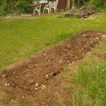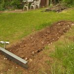 Ganz neu aufgebaut wird der Schneckenzaun um ein Beet, ausgestochen in der Rasenfläche. Die Neuanlage eines Beetes mit Schneckenzaun beginnt am besten im Herbst des Vorjahres. Im Kleingarten habe ich im Oktober 2018 den Rasen Bereich einmal komplett durchgepflügt und bereits eine neue Beetfläche abgesteckt. Die 1 x 4 m große Fläche wurde von mir 2 Spaten tief umgegraben. Dabei werden auch mögliche Schneckeneier zerstört. Seitdem liegt die Beetfläche brach.