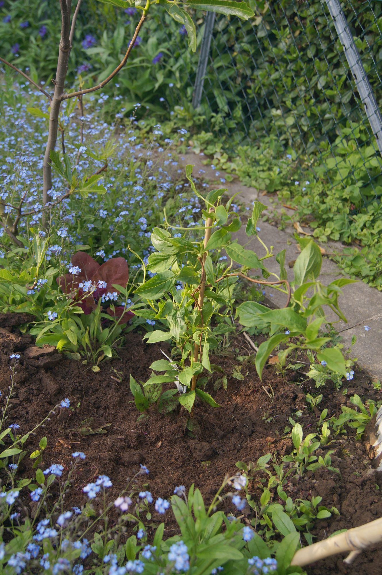Frühjahr 2024: Es dauert ungewöhlich lange. Auch nach 5 Jahren habe ich noch immer weder Kiwibeeren, noch Kiwis geernet. Obwohl ich alles getan habe, damit es ihnen gut geht. Hinter Johannisbeeren und Feigenbaum haben die Kiwi den notwendigen Schatten.