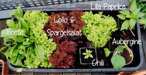 Ich habe jetzt auch etwas mehr Anbaufläche, da mir elho vier große Pflanz-Gefäße zur Verfügung gestellt hat (Werbung). Bereits seit März habe ich die Pflanztische und den „beweglichen Garten“ in Nutzung. Die Anzucht-Tische waren bisher ein geschützter Rückzugsort für die pikierten Setzlinge, mal draußen auf der Terrasse oder bei Kälteeinbruch drinnen in der Küche. Ja, manchmal war es echt eng beim Kochen.