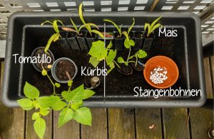 Ganz frisch in Nutzung habe ich den „Green Basics Garten„. Mit einer Pflanzhöhe von 45 cm kann hier auch der tief wurzelnde Mais „Morado“ einziehen. Dazu kommen noch zwei vorgezogene Kürbis, zwei Tomatillo und Stangenbohnen. Ich bin mir sicher, dass wir toll aussehen.