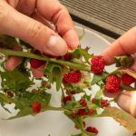 Ich ernte den Erdbeerspinat indem ich ihn mitsamt den Wurzel aus der Erde ziehe. Dann streife ich die roten Früchten und die Blätter von den holzigen Stengel ab. Das Rezept für den Glasnudelsalat:
