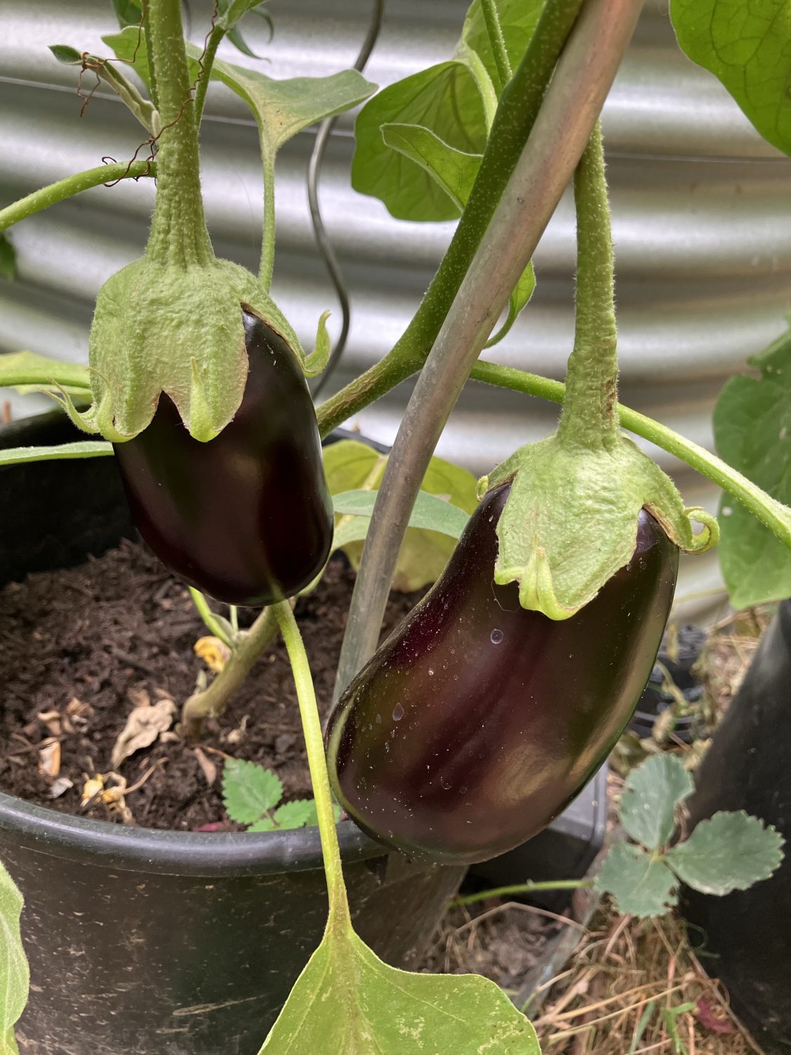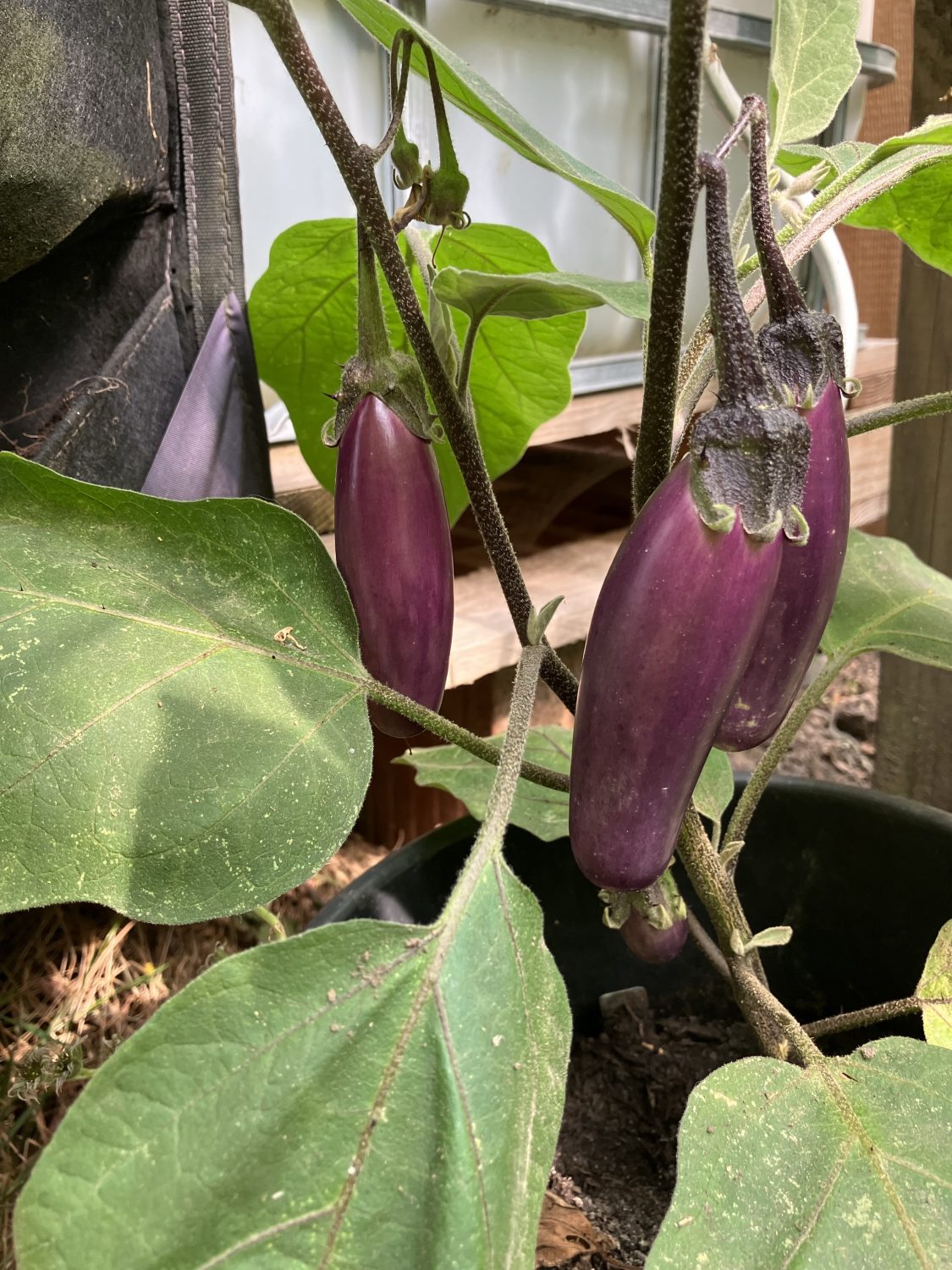 Unter dem Tomatendach habe ich weitere Töpfe mit Auberginen aufgestellt. Hier gefällt es ihnen noch besser. Mollig warm, aber nicht übertrieben heiß. So kann ich bis Mitte September fleißig weiter ernten. Dann wird es den Auberginen zu kühl.