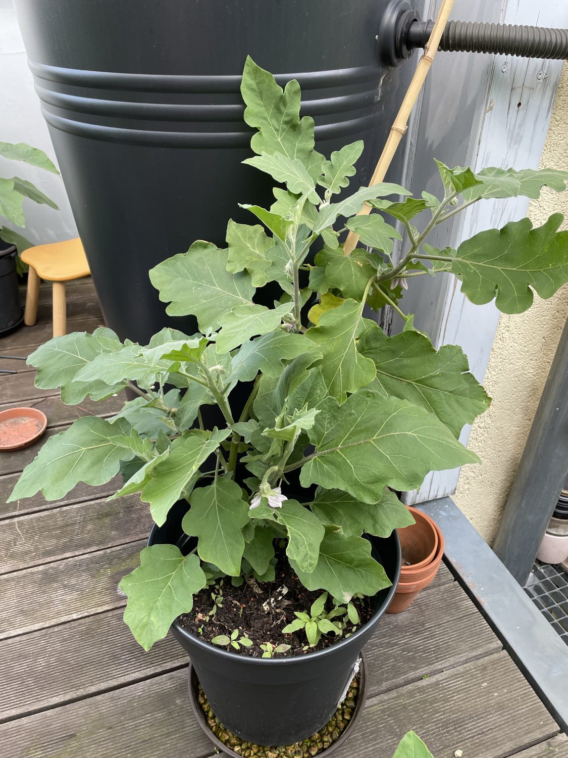 Hier oben im Balkongarten sind die die kleinfruchtigen Auberginen wieder reif. Ganz alleine – in einem ausreichend großen Pflanztopf – gefällt es den Starkzehrern sehr gut. Gedüngt wird regelmäßig mit Wurmtee. So gibt es reichlich zu ernten.