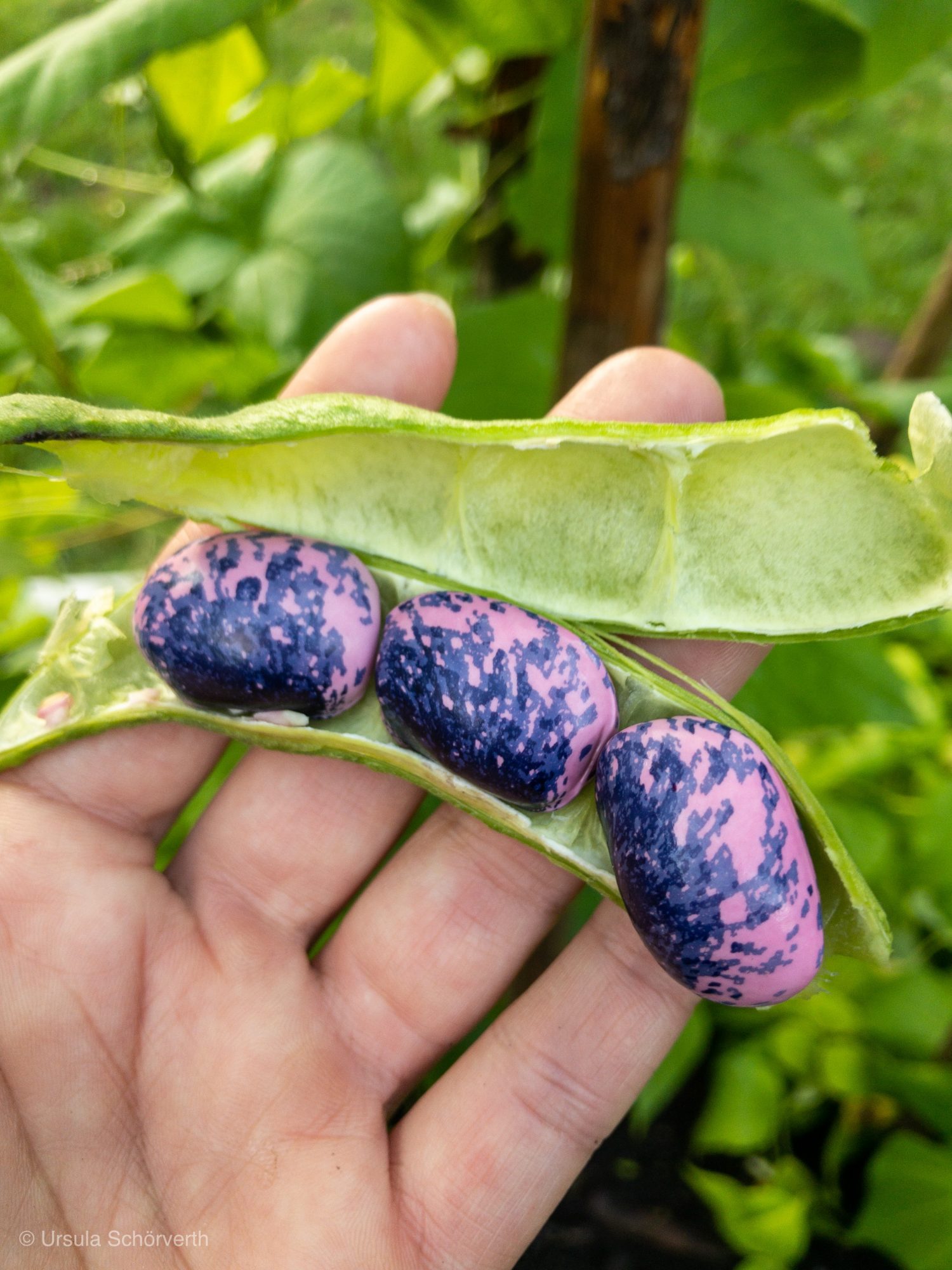 Die Kerne sofort herauslösen oder die Hülsen an einen luftigen und trockenen Ort aufhängen. So hat meine Schwiegermutter ihre Bohnenkerne für die nächste Aussaat aufbewahrt. Dann hat es der Speisebohnenkäfer nicht so einfach an die Kerne zu kommen.