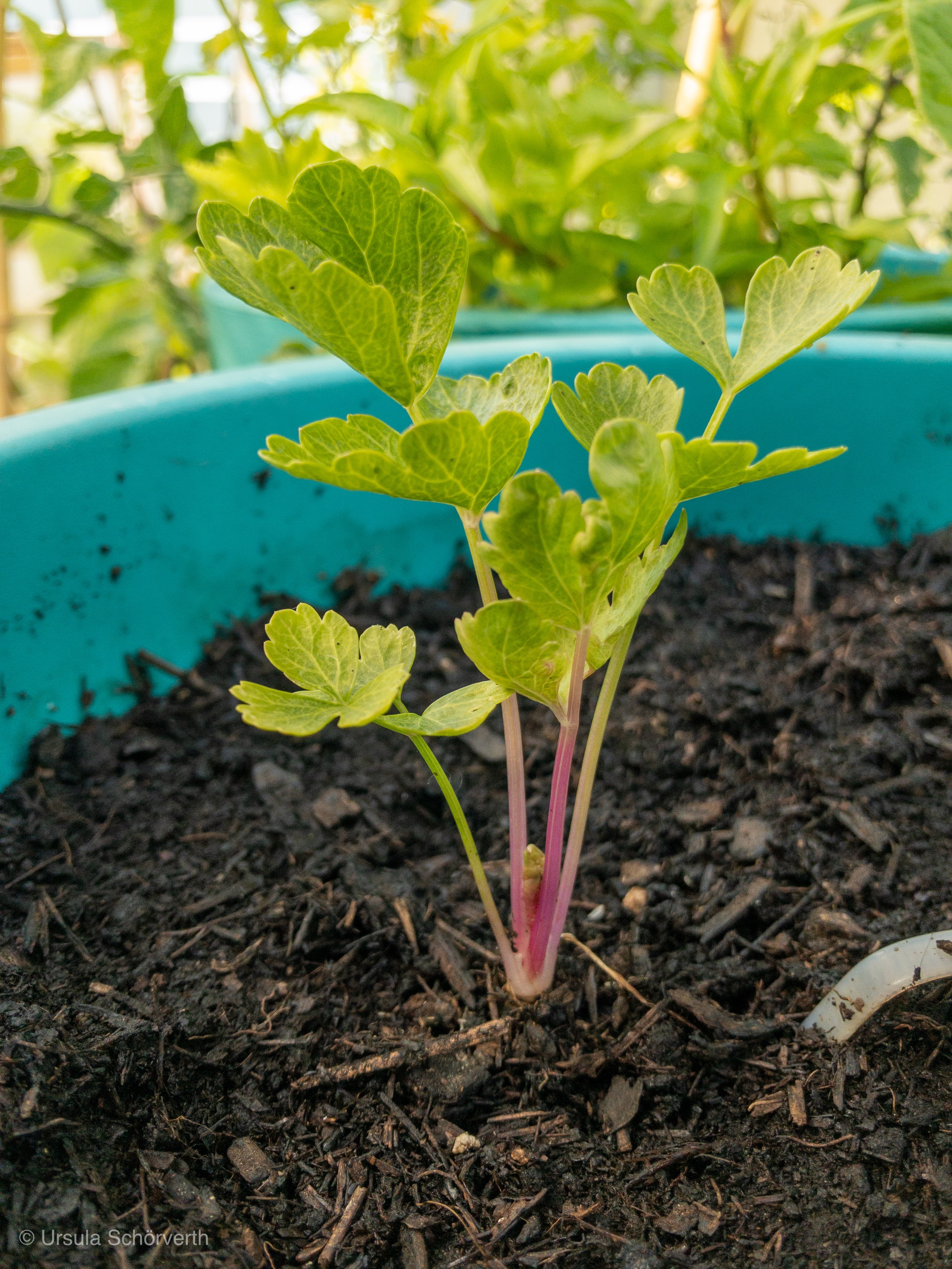 Seit der Erfahrung im letzten Winter bin ich überzeugte Verfechterin des Stangensellerie. Im Frühjahr 2018 habe ich zum ersten Mal Knollen- und Stangensellerie aus Samen selbst gezogen. 3 von fünf Stangensellerie Pflanzen habe ich im Balkongemüsegarten angesiedelt. Hier standen sie in verschieden großen Töpfen und Kübeln das ganze kommende Jahr. Sommer und Winter, die ganze Zeit im Freien.