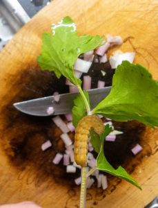 - Das frisch geerntete Gemüse gut säubern, nach Insekten absuchen und dann klein schneiden.