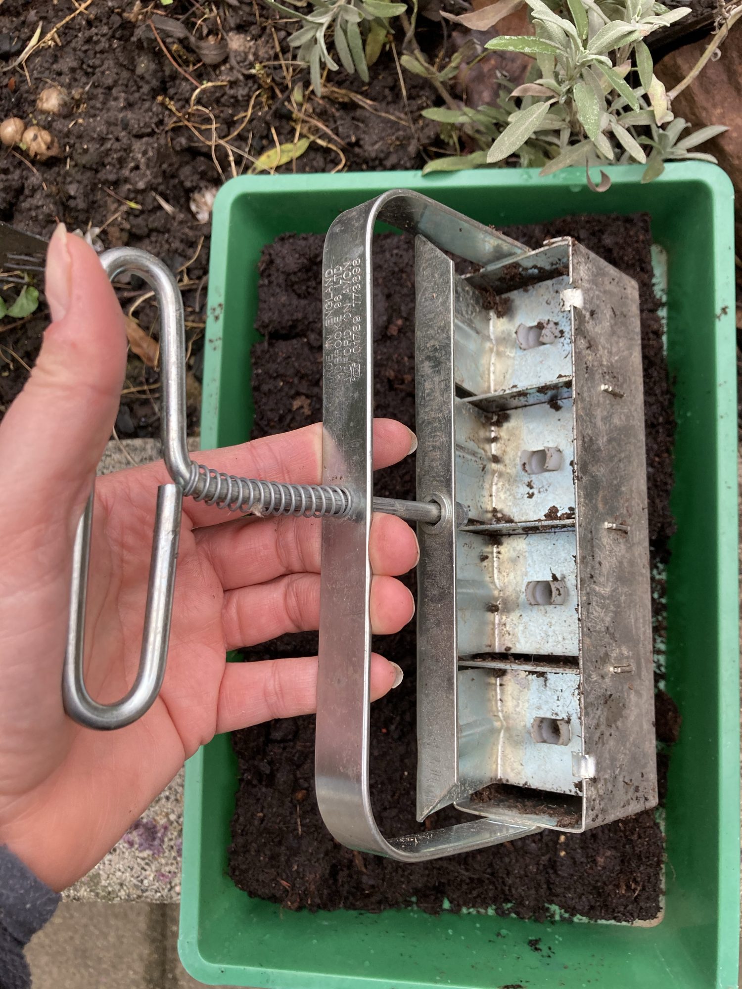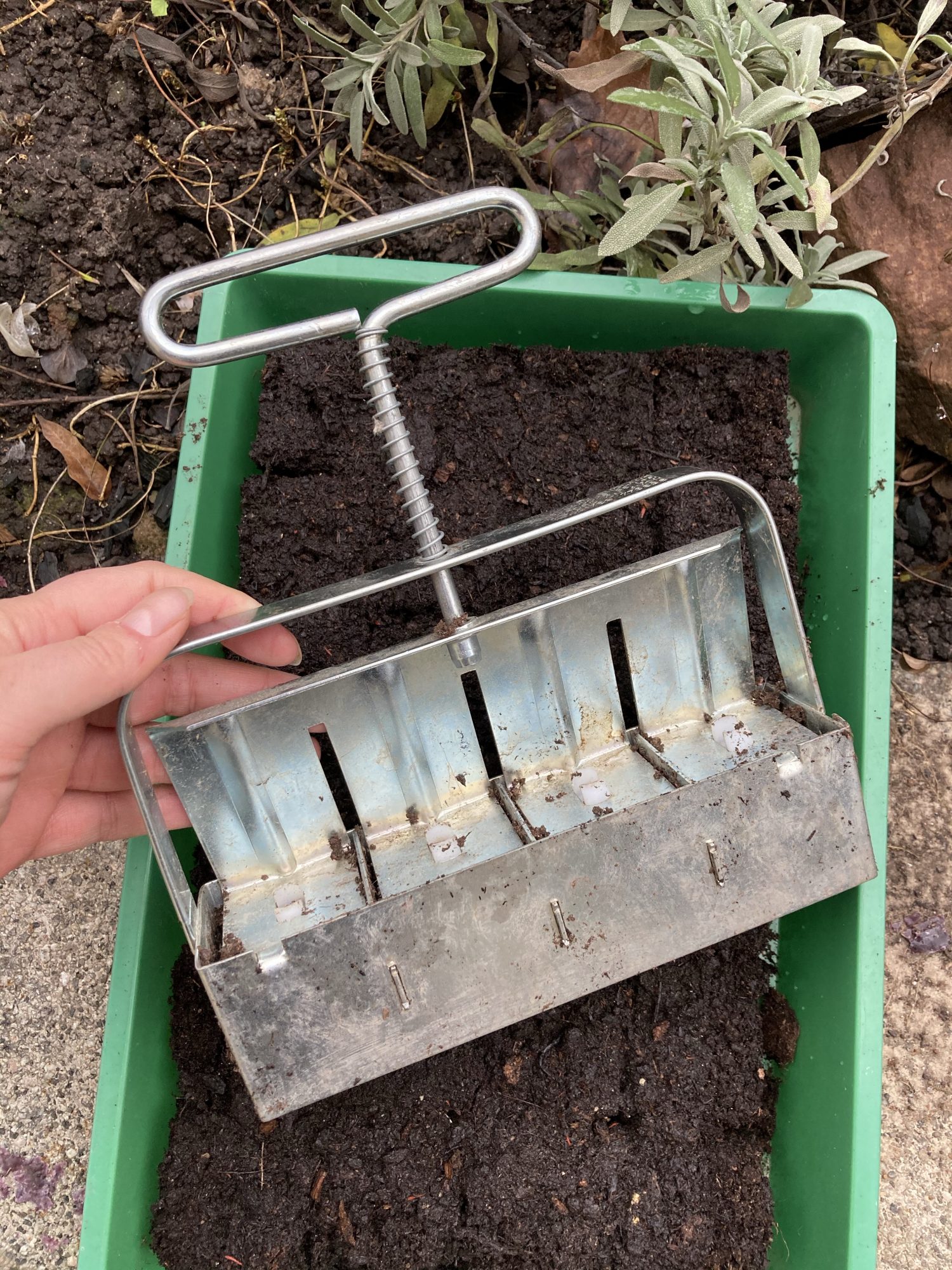 Für die Aussaat im Januar eignen sich Erdballen. Mittels einer speziellen Presse werden gleichzeitig 4 Würfel aus gepresster Aussaaterde erstellt. Die Erdballen haben eine Vertiefung von rund 1 cm. Es reicht, wenn heute pro Erdballen nur ein Samen gesät wird. Kohl geht sehr zuverlässig auf. Den einen oder anderen Würfel ohne Pflänzchen kann man da verschmerzen. Alle Erdballen kommen in eine Anzuchtkiste mit durchsichtiger Haube.