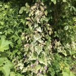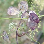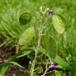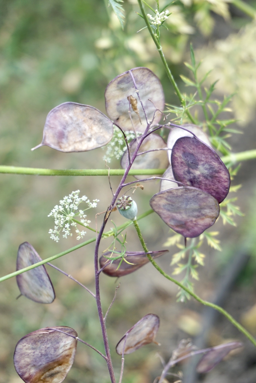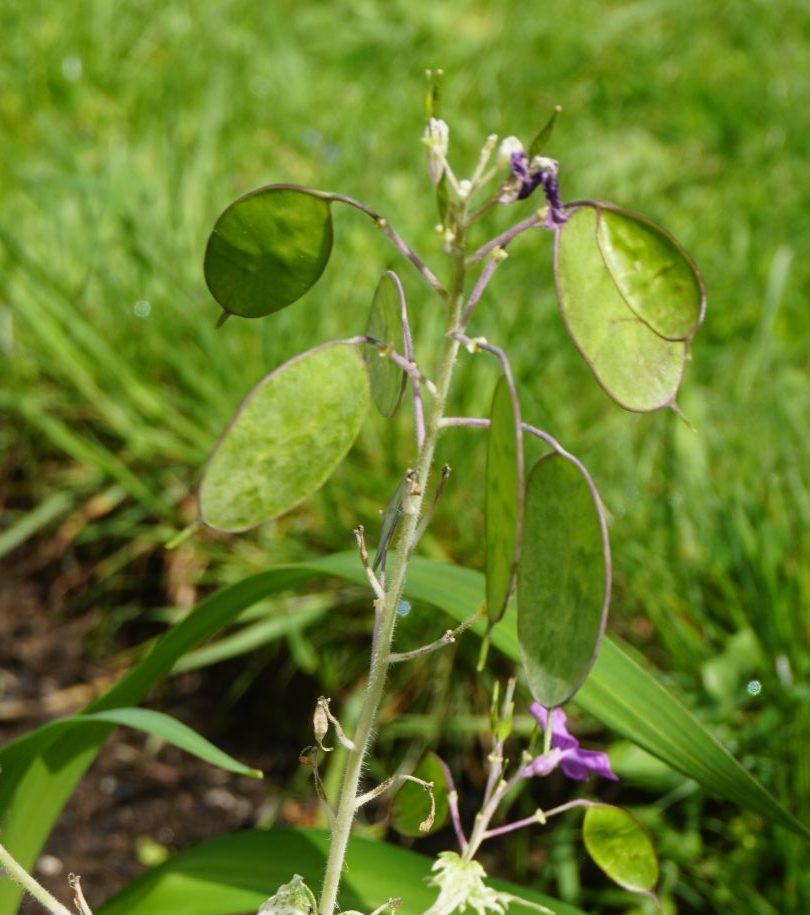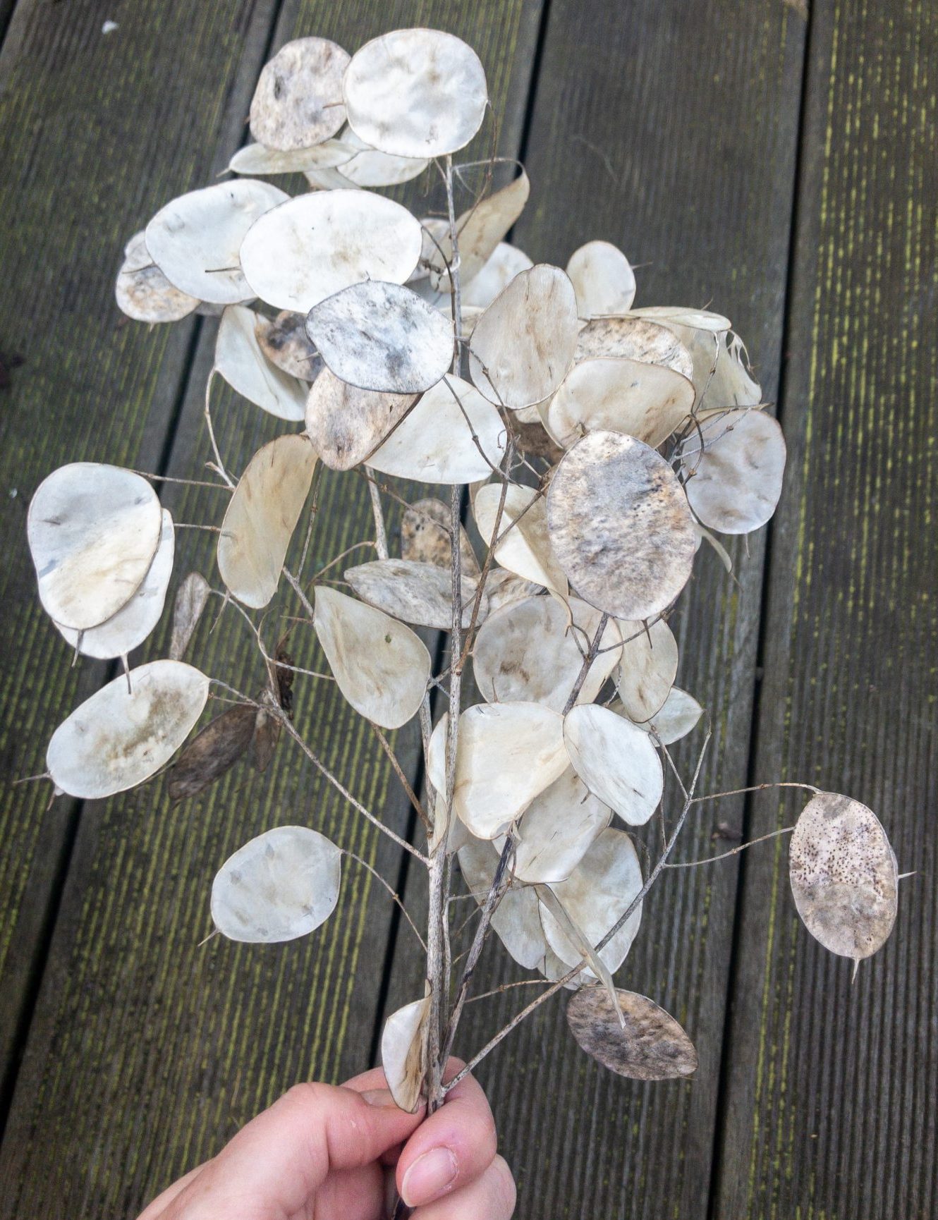 Die dritte Sorte, welche sich bei mir im Hausgarten findet, kommt verhältnismäßig unspektakulär daher. Große grüne Blätter, im zweiten Jahr weiße Blüten und dann die Schötchen. Das Besondere an diesem Silberblatt ist die Masse an gebildeten Schötchen. Sie lassen sich hervorragend für jede Herbstdeko verwenden und gehen nie aus. Diese Sorte Silberblatt überwuchert schon das eine Blumenbeet. Da muss ich noch ordnend eingreifen.
