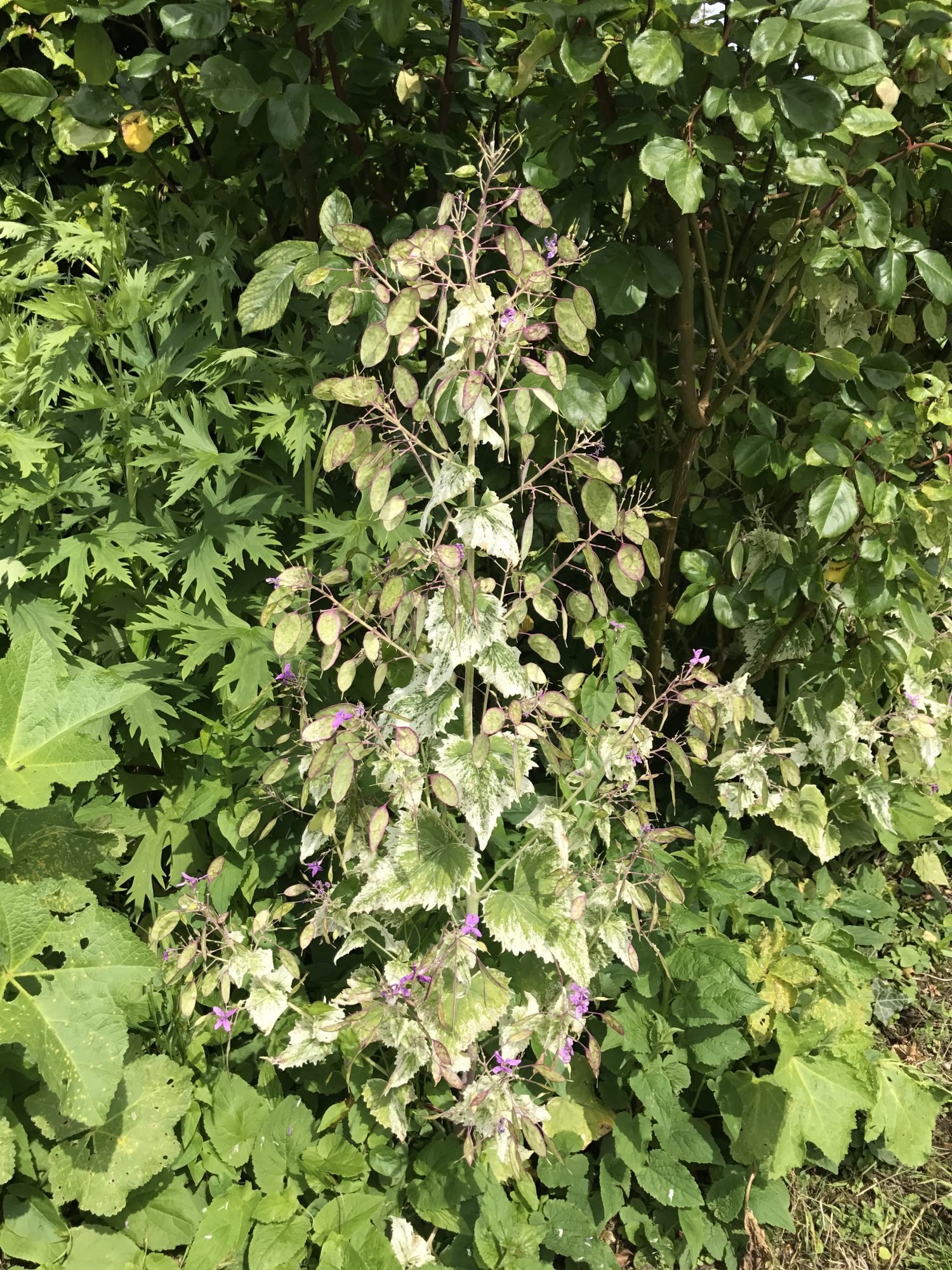 In einer etwas wilderen Ecke fand sich ein Silberblatt (Lunaria annua) mit rosa Blüten und einer tollen Blattzeichnung. Die stark gezackten Blätter dieser Sorte haben einen weißen Rand. Leider gab es bei diesem Besuch auf der Farm keine ausgereiften Samenstände. Keiner auf der Farm kannte denn den Namen dieser Sorte. Die Suche nach den Samen im Internet blieb erfolglos.