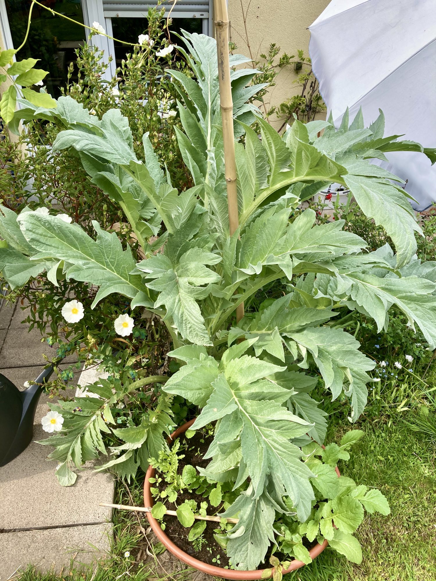 Spannend finde ich, dass auch beim Gärtnern in Container und Pflanzkübeln die Prinzipien der Permakultur Anwendung finden können. Wenn ich mir meine Pflanzcontainer anschaue, findet sich in manchen schon mehrjähriges oder sich selbst ausgesamtes Gemüse, wie den Sellerie und die Litschitomate. Die Stangensellerie Mutterpflanze hat vorletztes Jahr in einem Pflanzkübel überwintert und uns fleißig Stangen geliefert. Im letzten Sommer hat sie dann geblüht und Samen gebildet. Offensichtlich habe ich nicht alle Samen abgesammelt, wie an den vielen kleinen Pflänzchen zu erkennen ist.