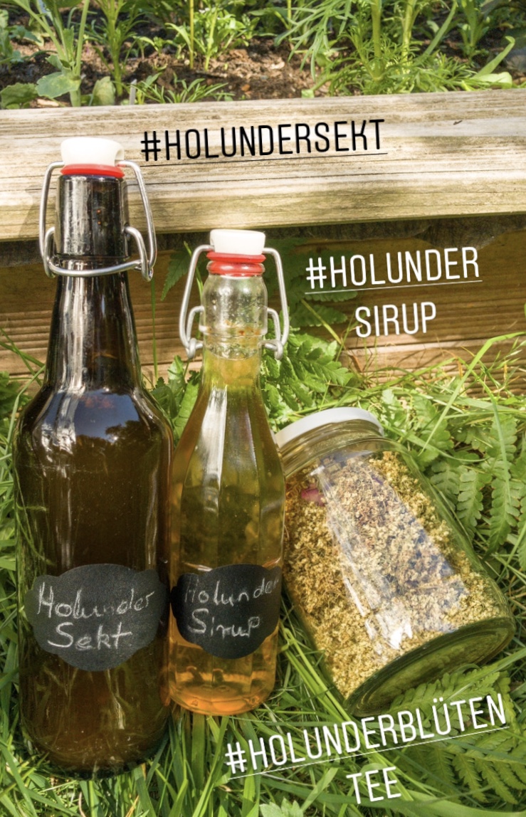 Holunderblüten und Holunderbeeren sammle ich schon sehr lange. Den Ansatz als Sirup gibt es bei uns bestimmt schon seit 15 Jahren als Hausmittelchen bei leichtem Husten. Wie das sammeln von zum Beispiel Bärlauch gehört das zu unserem eigenen Jahresrhythmus. Früher habe ich die Holunderbüsche im nahen Wald beerntet. Seit wir den Kleingarten haben, hole ich zumindest die Holunderblüten nur noch von dort. Beeren konnte ich in den letzten 5 Jahren allerdings nicht mehr ernten. Weder im Kleingarten, noch im Wald. Die Sommer sind viel zu trocken, die Beeren wollen nicht wachsen. Meine geliebte Holunder-Birnen Marmelade ist deshalb Geschichte.
