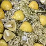 - Nach 5-6 Tagen die Zitronenstücke heraus holen und auspressen. Den Saft der Zitronen wieder in den Sirup geben. Nun die Dolden entfernen. Damit so viele Schwebstoffe wie möglich aus dem Sirup entfernt werden, den Sirup durch das Baumwollnetz Teesieb gießen. Es dauert, da der Sirup dickflüssig ist. Aber die Gefahr einer späteren Gärung wird dadurch deutlich verringert. Der Sirup ist haltbarer.