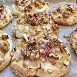 - Apfelstücke, Feigen und Walnüsse auf den Teigstücke legen und leicht andrücken.