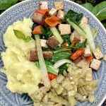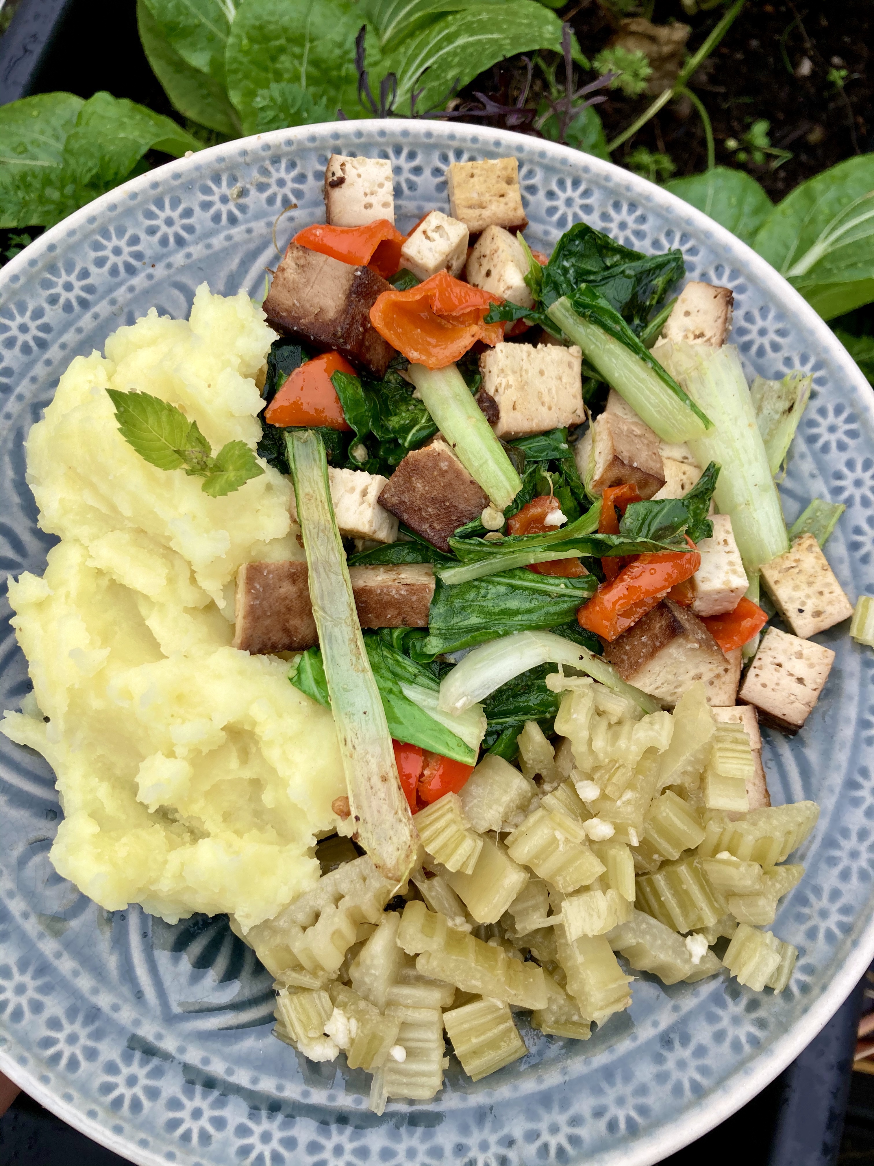 Die Gemüsepfanne mit Tofu ist noch schneller gemacht. Das Gemüse ganz kurz andünsten mit einem Wok Öl. Pak Choi schmeckt am besten, wenn er die Pfanne maximal eine Minute gesehen hat. Leicht salzen, Tofu dazu, fertig. Schneller gesund kochen geht fast nicht mehr. Da dauert das Ernten und putzen des Gemüse um einiges länger.