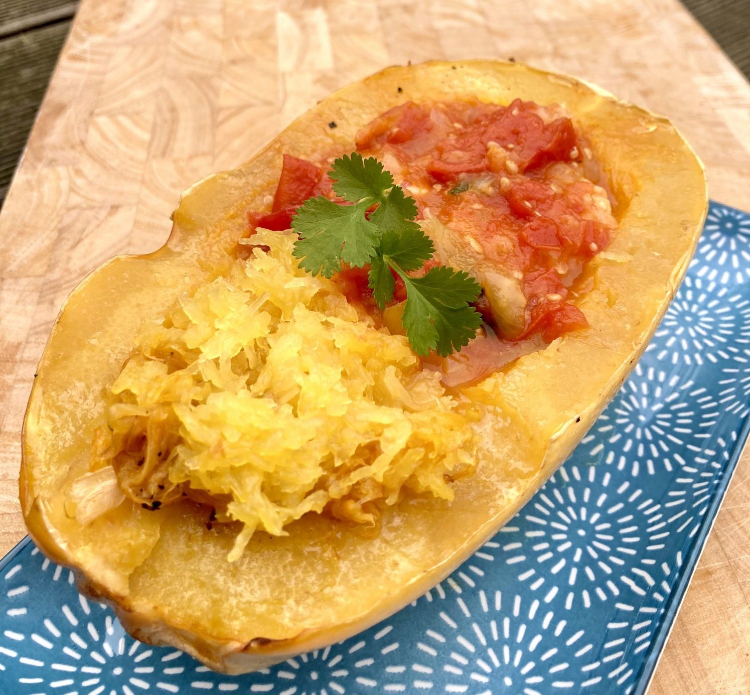 Zusammen mit dem Spaghetti Kürbis, den ich wie üblich im Ofen für fast eine Stund gebacken habe, ergibt das ein leckeres Mittagessen. So kommt noch einmal kurz der Sommer zurück, bevor alles wieder im November Grau verschwindet.