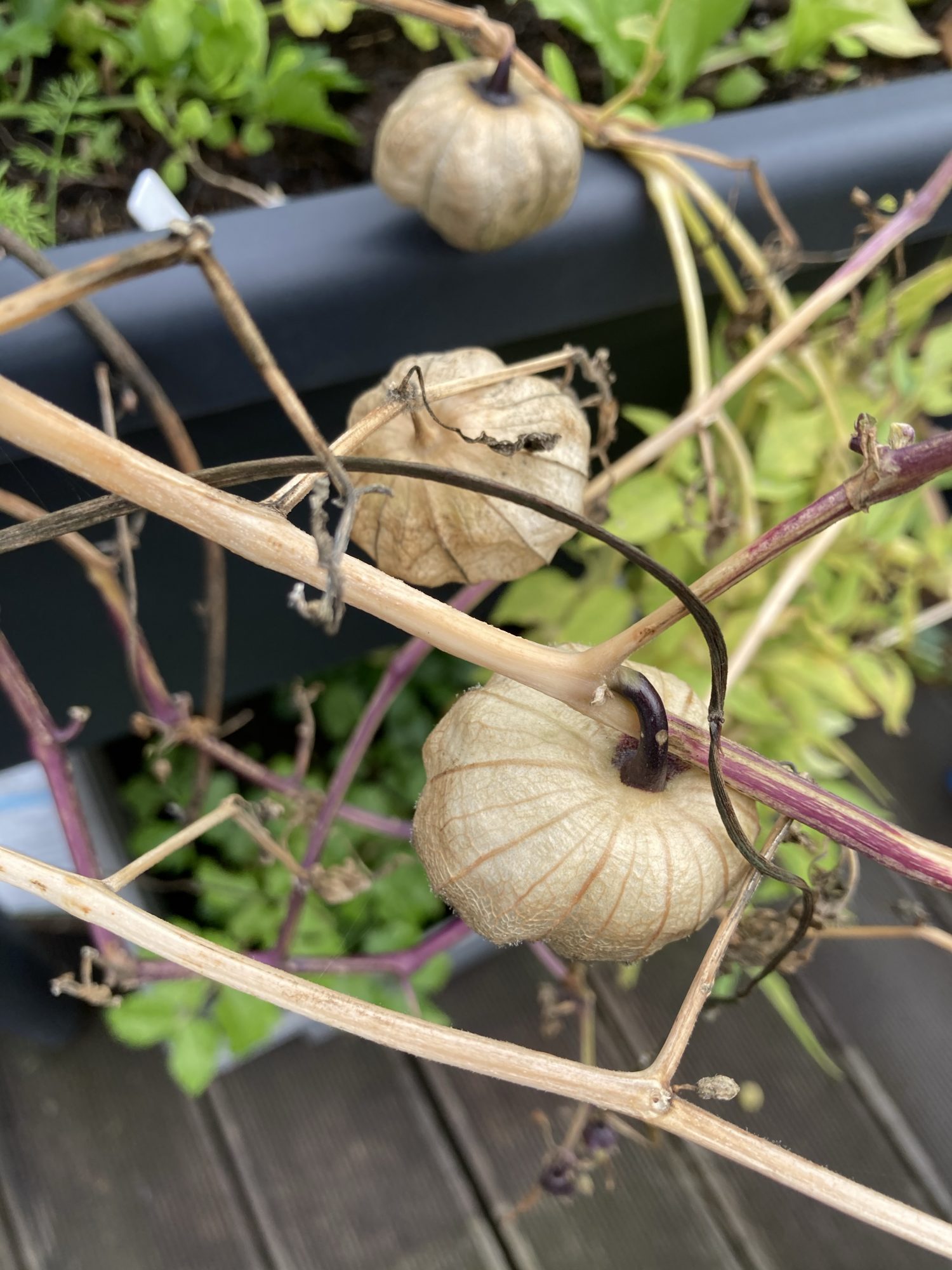 Die Versuche Tomatillo zu überwintern haben bisher nicht funktioniert. Innerhalb kürzester Zeit hatte ich eine extensive Läusezucht und vertrocknete Pflanzen im Winterquartier. Die steckten dann auch noch andere Quartiergäste an mit Blattläusen. Deshalb überwintere ich die Tomatillo Pflanzen nicht mehr. Jedes Jahr ab Januar säe ich sie wieder neu an. Härter im Nehmen sind da die Früchte der Tomatillo. Haben sie ihre Pergamenthülle bereits satt ausgefüllt, können selbst grüne Früchte noch nachreifen. Das geht draußen, wenn es trocken und nicht zu kalt ist. Besser ist es natürlich drinnen. Genau wie Tomaten reifen sie mit etwas Geduld in einem trockenen und moderat kühlem Lager nach. Dann am besten die ganze Pflanze vorsichtig aus der Erde ziehen, Wurzeln abschneiden und die Pflanze mitsamt den Früchten verkehrt herum aufhängen.