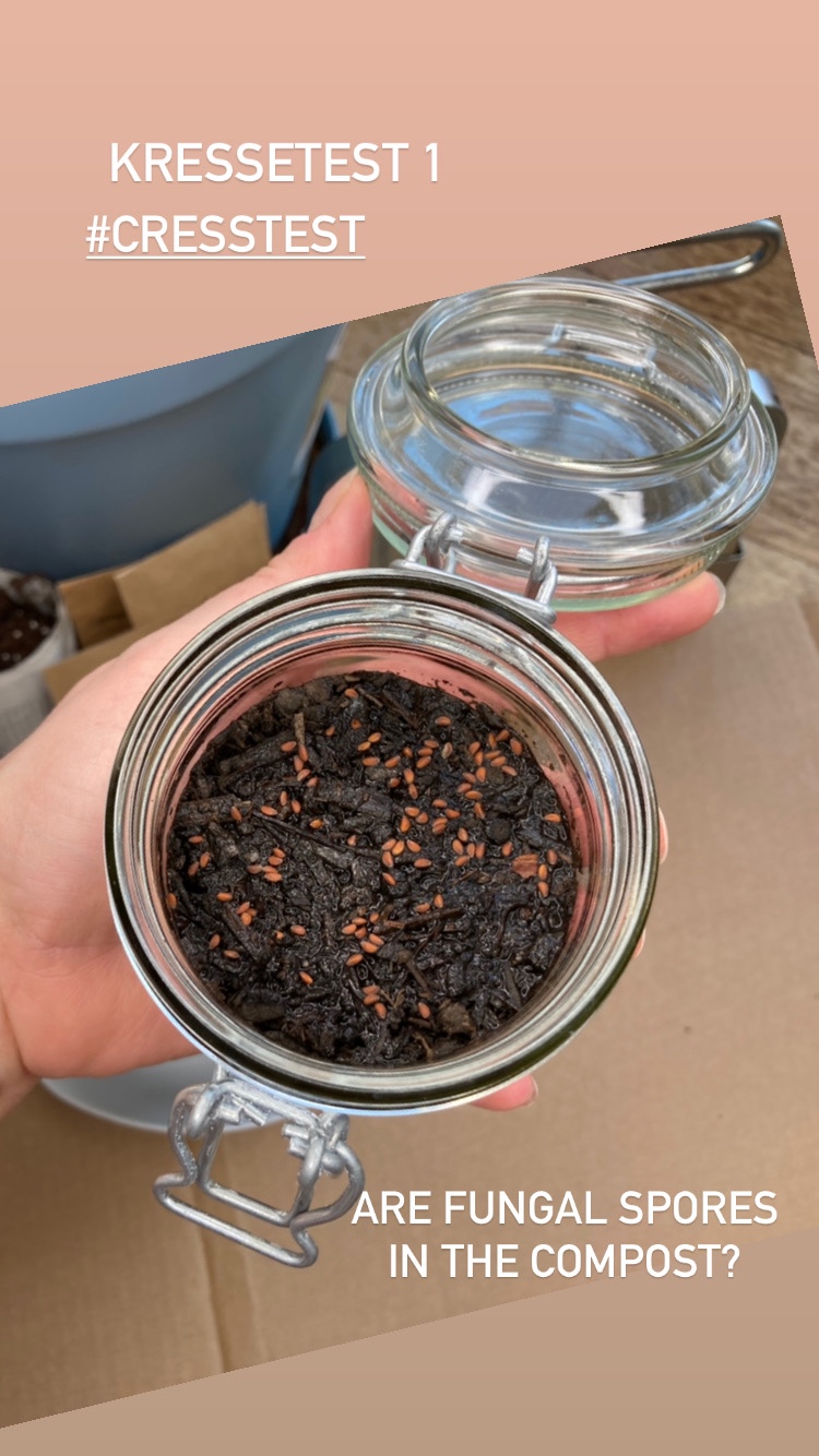 Für den Pilzsporen Kressetest wir zuerst der Kompost in ein Behältnis eingebracht. Anfeuchten und dann die Kresse darauf verteilen. Nun muss das Behältnis noch Luftdicht verschlossen werden. Am besten ein Einmachglas mit Bügelverschluß verwenden. Es geht auch ein Glas, welches mit Frischhaltefolie verschlossen wird.