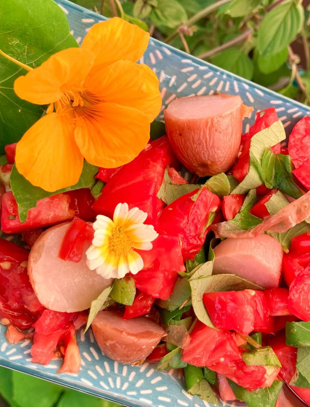 Tomaten-Kartoffel Salat mit essbaren Blüten