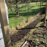 Heute kümmere ich mich um einen Rasenstreifen zwischen Tomaten Unterstand und Nachbars Zaun, oberhalb des neu aufgestellten IBC Tankes. Dieser knapp einen Meter breiten und 5 m lange Streifen wird nur von mir betreten. Und auch nur, um ihn zu mähen oder um im Hochsommer Tomaten von hier aus zu Ernten. Deshalb wandle ich den Rasenstreifen großteils zu einer Futterweide für Insekten wie Hummeln und Bienen um.