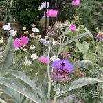 Vor den Blumensamen kommen noch Zwiebeln und Wurzeln von einjährigen Sommerblumen, wie die Prachtscharte, Gladiolen und Crocosmia mit in das Blumenbeet. Für Wurzel, welche erst später in die Beete kommen – zum Beispiel Dahlien – setze ich einen Topf in das Beet. Die bleiben als Platzhalter und es wird darum herum gesät und gepflanzt.