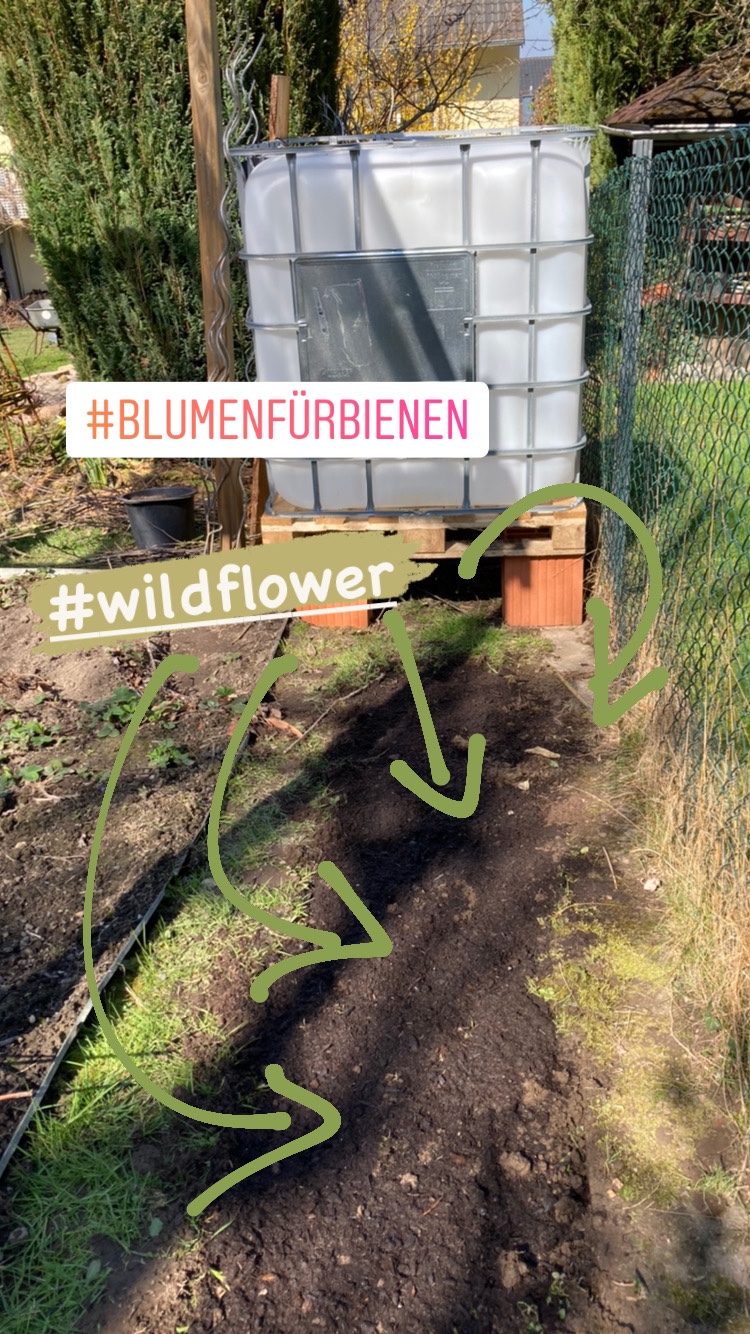 Dazu erst die Grasnarbe abnehmen und überflächlich lockern. Dann kommt bei mir rund 5 cm Blumenerde drauf. So können die Blumen besser wurzeln. Alles gründlich wässern, dann kommt Saatgut einer bunten Blumenmischung auf die Erde. Zum Schluß nochmal dünn Erde darüber gestreut, leicht angedrückt und nochmals gründlich Wässern. So, jetzt können die Insekten direkt vor ihrem Hotel im Sommer die erste Futterstelle anfliegen. Es darf natürlich nicht die einzige Futterstelle – also Blumenwiese – bleiben. In der Saatgutmischung sind Borretsch, Ringelblumen, Kornblumen, Nelken, ungefüllte Tagetes, Lein, Hasenohr, Schafgarbe und Jungfer im Grünen enthalten. Ich säe noch Amaranth und Schmuckkörbchen mit ein fürs Auge. Also schnell noch weitere Blumenbeete ansäen, bevor es bereits wieder zu spät ist.
