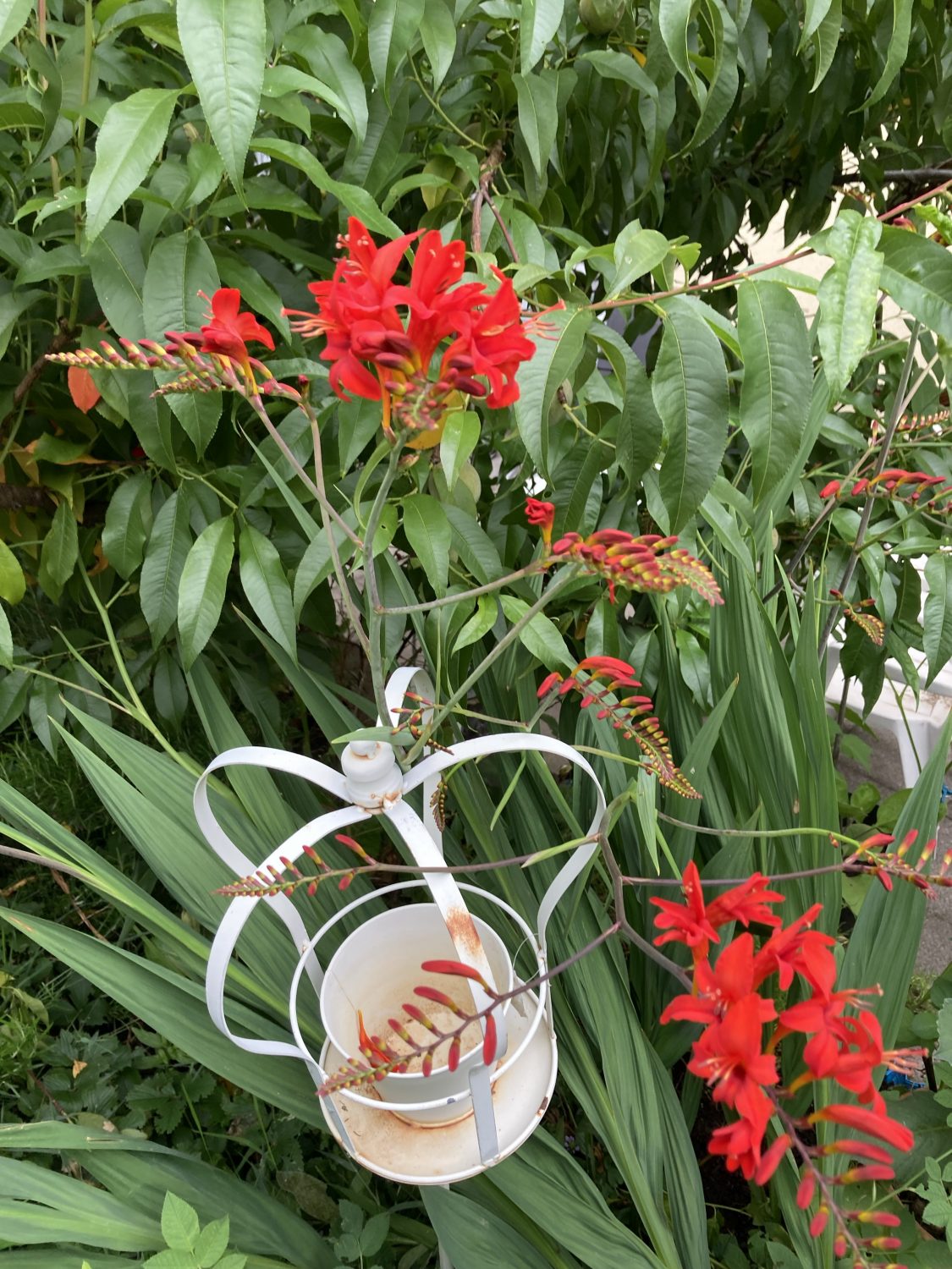 Vor den Blumensamen kommen noch Zwiebeln und Wurzeln von einjährigen Sommerblumen, wie die Prachtscharte, Gladiolen und Crocosmia mit in das Blumenbeet. Für Wurzel, welche erst später in die Beete kommen – zum Beispiel Dahlien – setze ich einen Topf in das Beet. Die bleiben als Platzhalter und es wird darum herum gesät und gepflanzt.