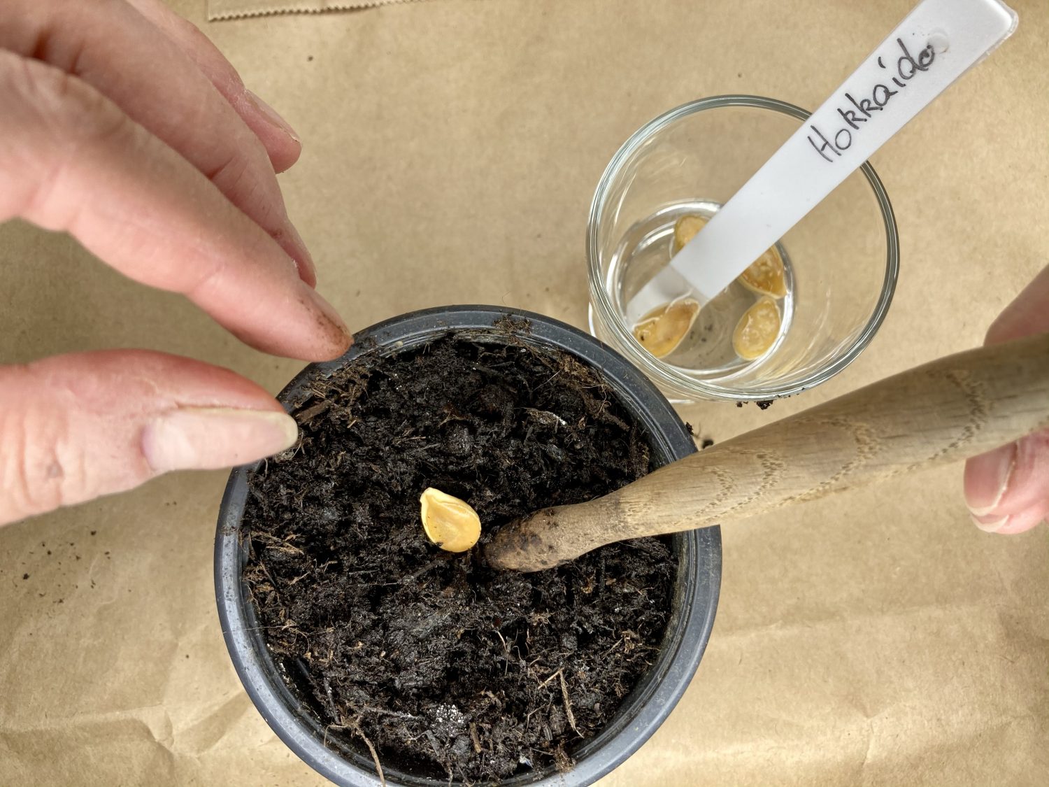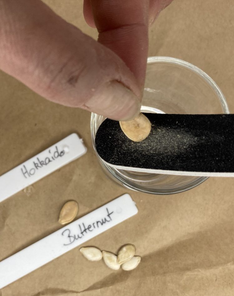 Heute fange ich zumindest mit den großen Kürbissorten an. Der Gruselkürbis, Spaghettikürbis, ein Schnitzkürbis und der „Galeux d’Eysines“ haben relativ große und stabile Samen. Deshalb erhalten sie als erstes einen Beauty Behandlung. Mit einer alten Nagelfeile schleife ich die runden Ende der Kürbiskerne vorsichtig an. Dann folgt eine Nacht lang ein Wasserbad. Das Wasserbad erhalten auch alle anderen „Kürbissamen“, wie Zucchini und Gurken.