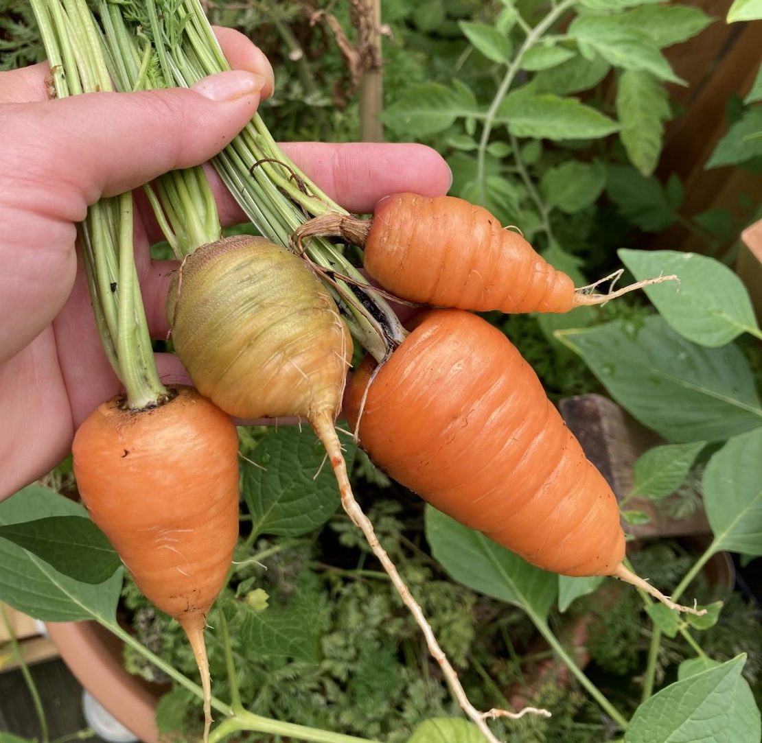 Der erste Punkt ist wichtig, da wir alle so viel wie möglich ernten wollen – das was möglich ist bei dem vorhandenen Platzangebot. Denn Platz bzw. Platzmangel ist neben der Wasserversorgungen das bestimmende Thema im Kübelgarten. Die richtige Sortenauswahl für die Kübelpflanzung ist deshalb wichtig. Wo Cocktailtomaten einen tollen Ertrag produzieren, ist die Ernte bei den großen Ochsenherztomaten im Balkon Gemüse Garten eher mager. Karotten Wurzeln verkümmern oder machen die „Biegung“, weil sie den allzu nahen Topfboden erreicht haben. Zuckermais knickt einfach um und bildet keine Kolben. Mehr Infos findet ihr in meinem Ratgeber „Balkon Gemüse Garten“.