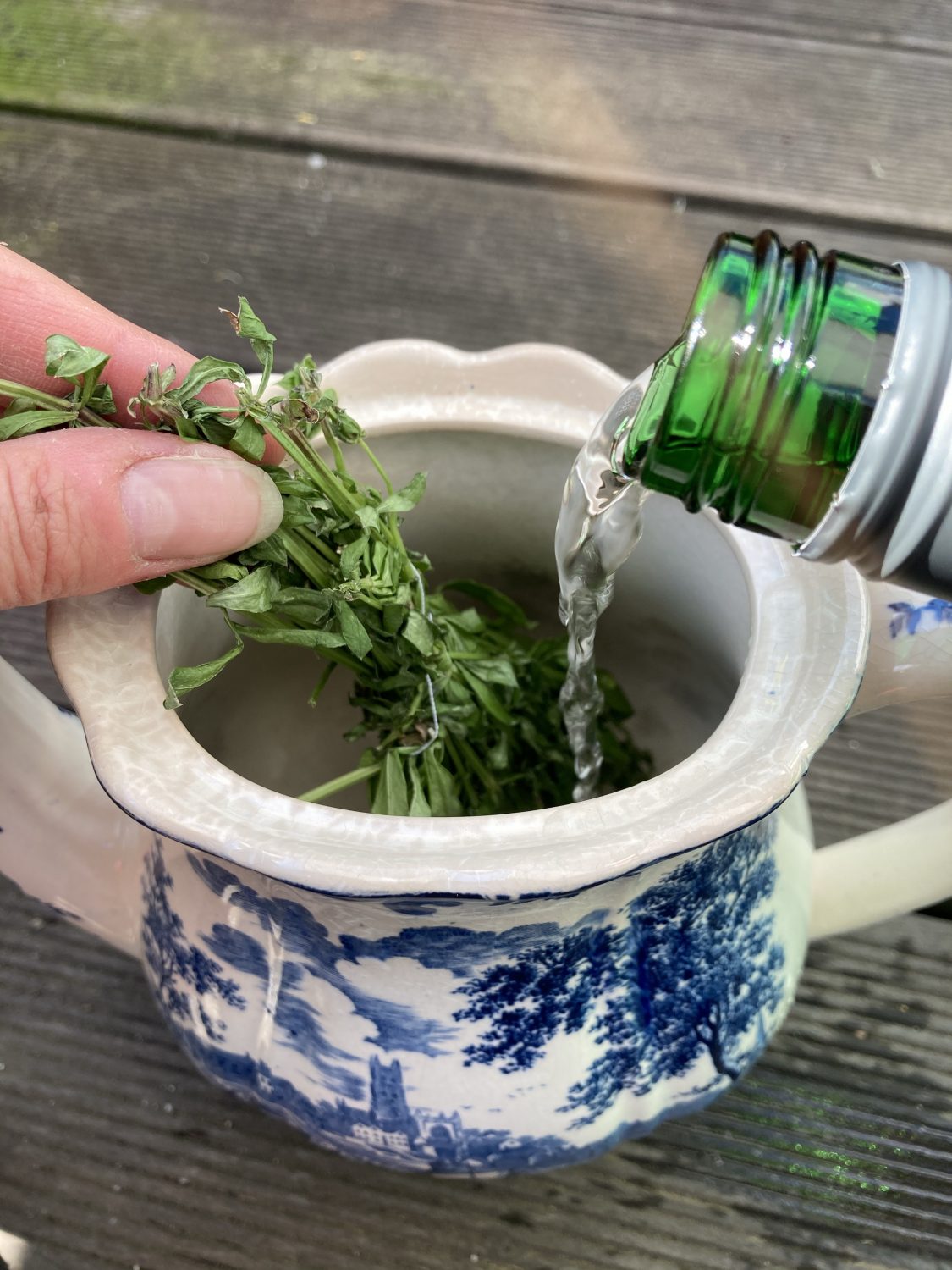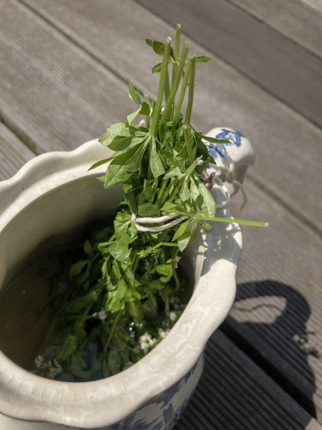 - Das Büschel Waldmeister in das Wasser hängen und für 3 Stunden ziehen lassen.