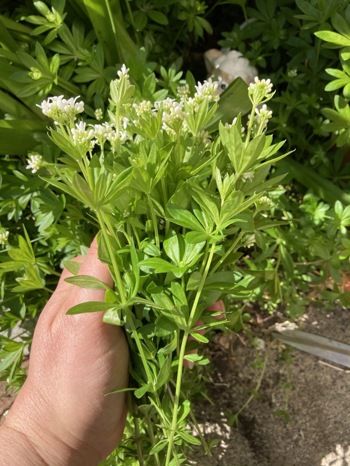 Ende April beginnt der Waldmeister bereits zu blühen an diesem geschützten Fleckchen Erde. Zeit ihn zu Ernten und daraus den Sirup für die Marmelade bzw. den Weinaufguß für die Bowle zu machen. Der frisch geschnittenen Waldmeister trocknet für rund eine Stunde in der Sonne. Erst so entwickelt sich der leckere Waldmeister Geschmack und Insekten haben Zeit zum Flüchten.