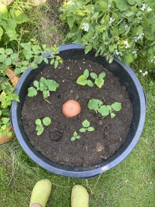 Jetzt wird aber erst einmal der Pflanzkübel bepflanzt. Vier verschiedene Gurken Sorten pflanze ich rund um eine Olla. Die Olla soll für eine kontinuierliche Wasserzufuhr sorgen. In unserem heißen Südgarten ganz wichtig. Denn Gurken reagieren besonders empfindlich auf selbst kurze Trockenphasen. Im maximalem Abstand von 20 cm sitzen jetzt auf 3 / 6 / 9 und 12 Uhr je eine