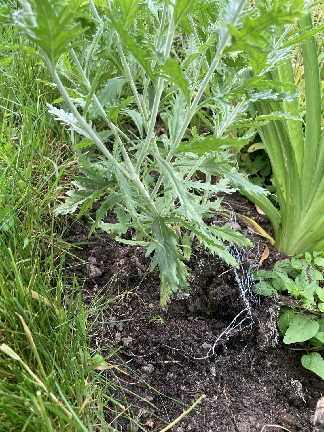 Auch manche Stauden sind bei den Wühlmäusen sehr beliebt. Im Frühjahr wollte ich meinen weißen Salbei umpflanzen. An seinem bisherigen Standort kümmerte er nur rum. Ich dachte es sei der Mangel an Sonne. Aber nein! Beim anpacken der Pflanze hatte ich sie auf einmal in der Hand. Unter ihr eine Höhle, aber keine einzige Wurzel mehr dran. Klar, da kann man nicht mehr wachsen. Der neue Salbei erhält jetzt gleich mal eines der Drahtkörbchen. Und ja, ich liebe den Geruch, wenn man diesen Salbei verbrennt. Aber Rituale mache ich damit keine.