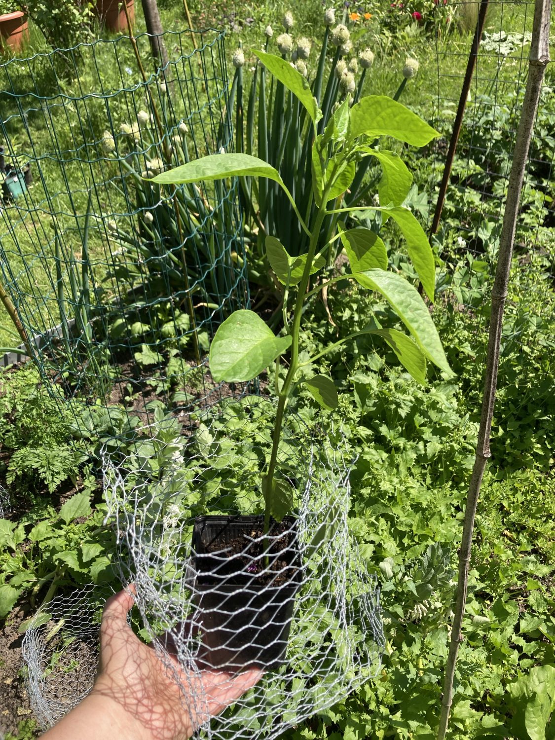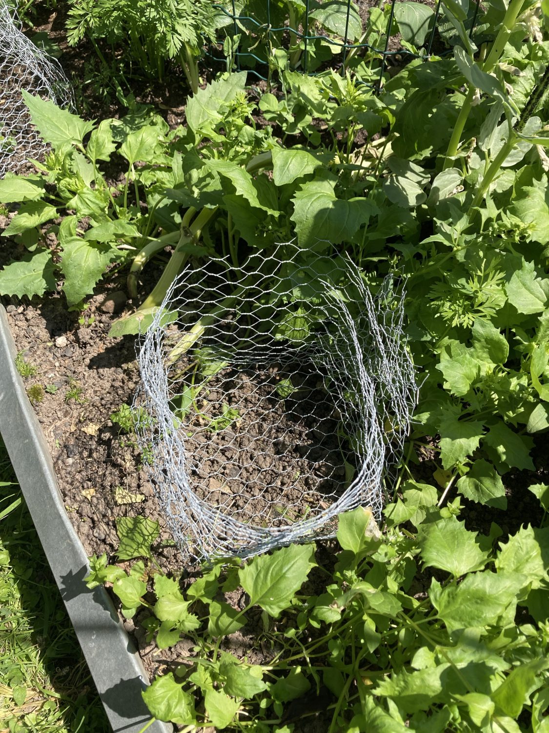 Um weitere Ausfälle zu vermeiden, habe ich aus Resten des Kleintierdrahtes kleine Körbchen geformt. In diese Körbchen pflanze ich jetzt hauptsächlich die selbst gezogenen Paprika Setzlingen. Sie kommen an durch den Wühlmaus Fraß frei gewordenen Platz im Gemüsebeet. So hat mein Verlust wenigstens noch etwas Sinnvolles.