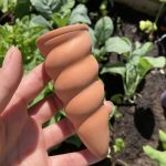 Ollas und auch die Tontüllen funktionieren nach dem gleichen Prinzip. Durch das poröse und unglasierte Material diffundiert das Wasser langsam in die sie umgebende Erde. Die Wurzeln der Pflanzen wandern in Richtung der Wasserquelle. Die Tontülle mit Flasche reicht allerdings immer nur für eine Pflanze. Ich setzte sie gerne bei Paprika, Chili und Auberginen. Hat auch einen dekorativen Effekt im Hochbeet, wenn bunte Glasflaschen verwendet werden.