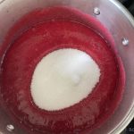 Wenden wir uns den schönen Seiten der Johannisbeeren zu. „Ausgangsprodukt“ für alle weiter Arbeitsschritte ist bei mir der Johannisbeersaft. Dazu die Beeren von den grünen Zweigen abzupfen und kurz aufkochen. Dann Saft und Beeren durch ein Sieb passieren. Passieren heißt durch einen feinmaschigen Sieb reiben. So werden die Häute, etwaige Verunreinigungen, aber vor allem die Kernchen entfernt. Das Ergebnis ist ein sämiger Saft, mit hohem Fruchtfleischanteil. Mit den Jostabeeren und Himbeeren verfahre ich genauso.