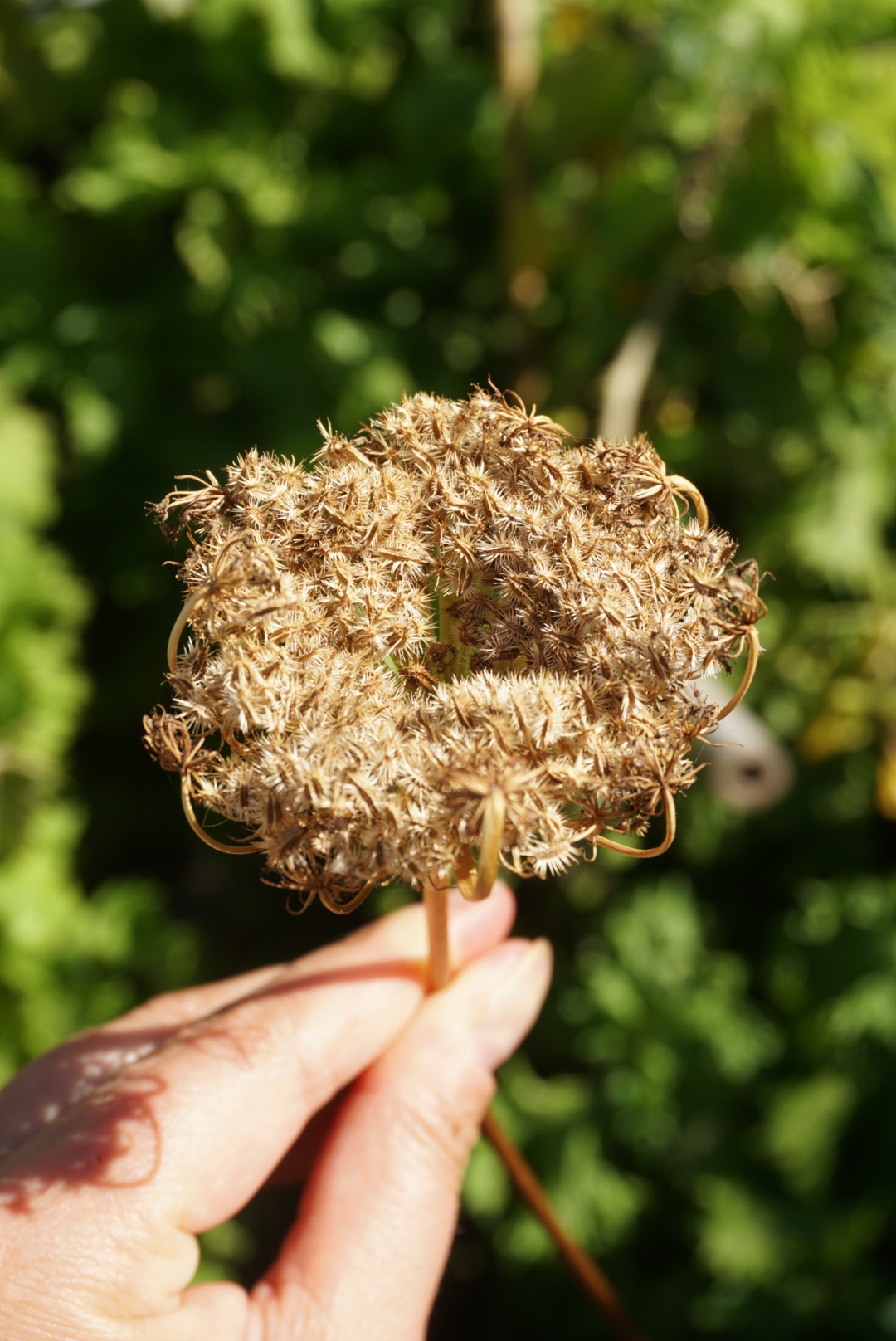 Auf die Dolden mit Samen der japanischen Karotte achte ich mit Argusaugen. Ich bin froh, dass sich hier im Pflanzkübel die letzten verbliebenen Samen gut entwickelt haben und ich nun tatsächlich selber Samen ernten kann. Denn leider kann ich die Samen dieser Karotte nicht mehr kaufen. Während der Blüte habe ich darauf geachtet, dass keine andere Karotten in der Nähe geblüht haben. Um eine Kreuzung mit anderen Karotten sicher zu vermeiden, hätte ich auch ein feinmaschiges Netz darum herum installieren können. Aber ich vertraue jetzt mal darauf, dass die 30 m bis zum nächsten Gemüsebeet zu weit waren für die bestäubenden Insekten.