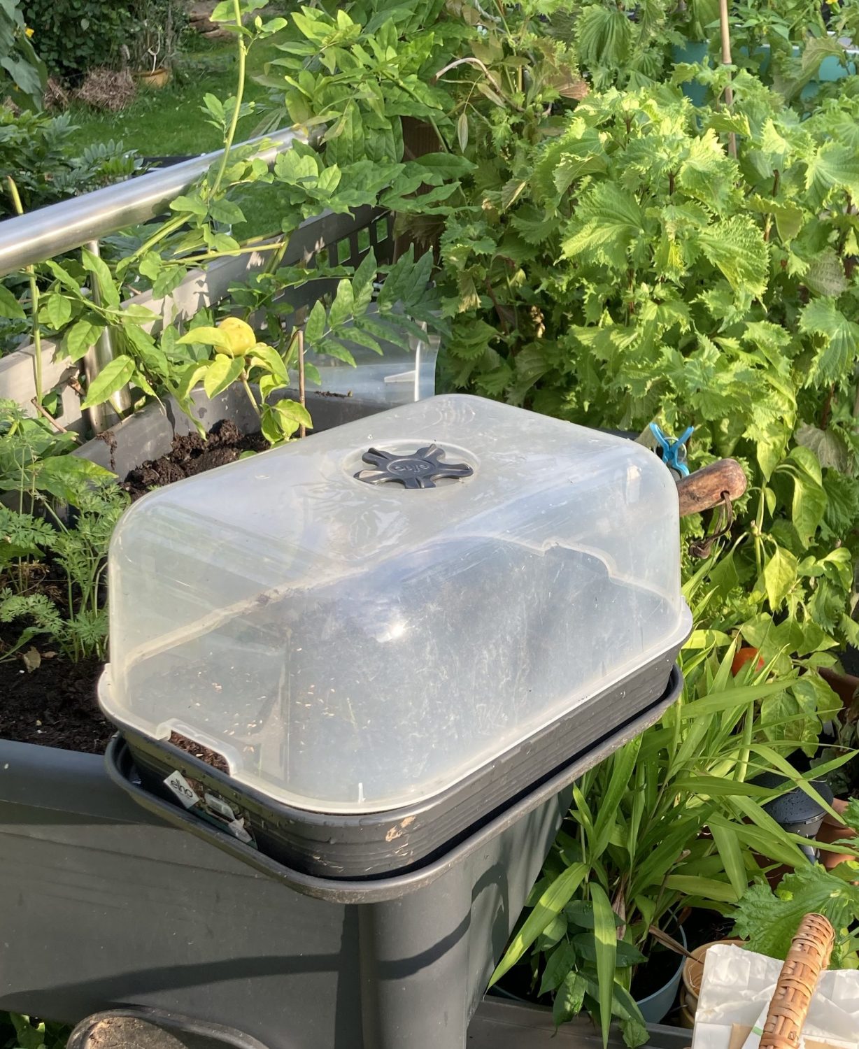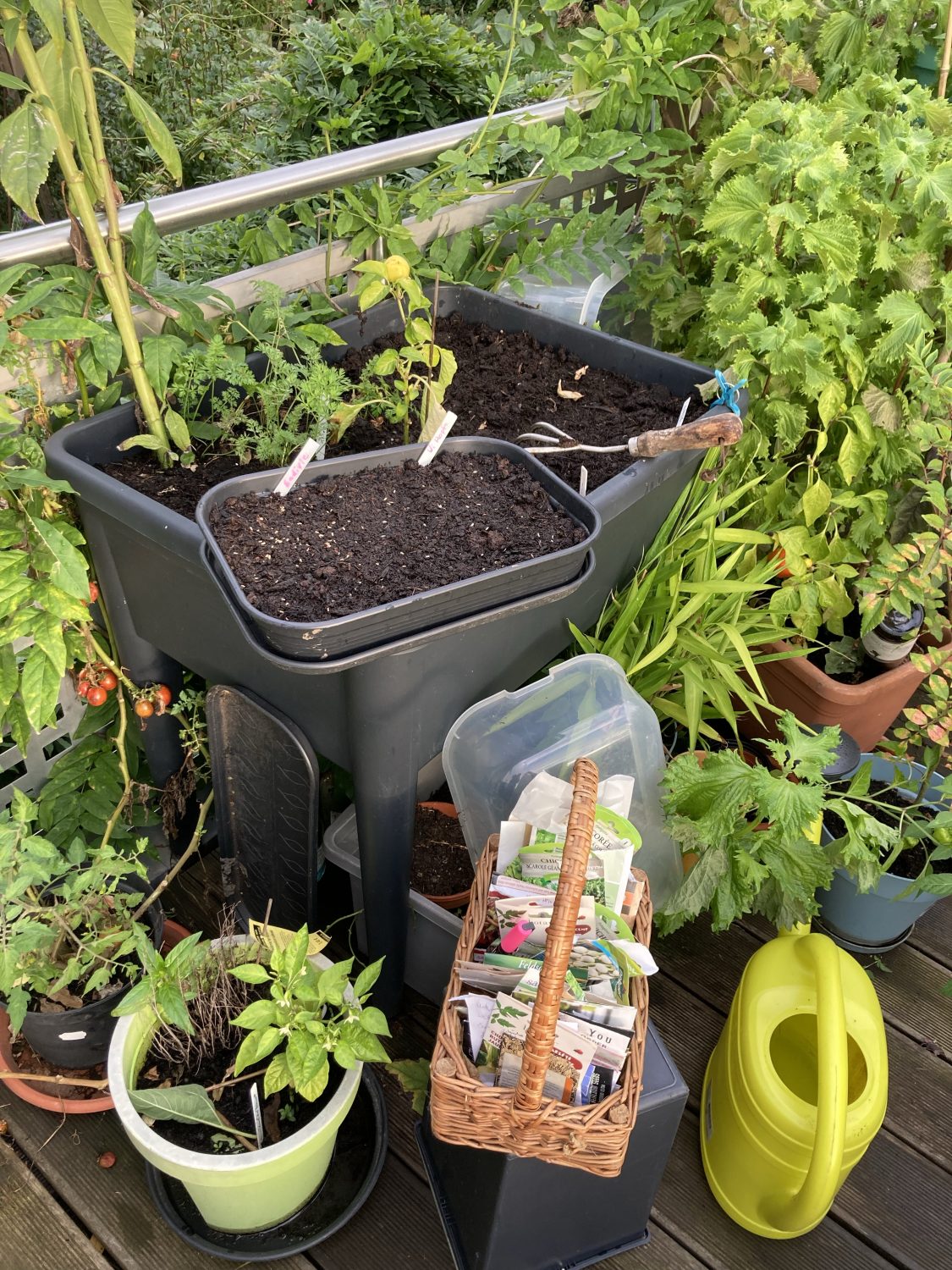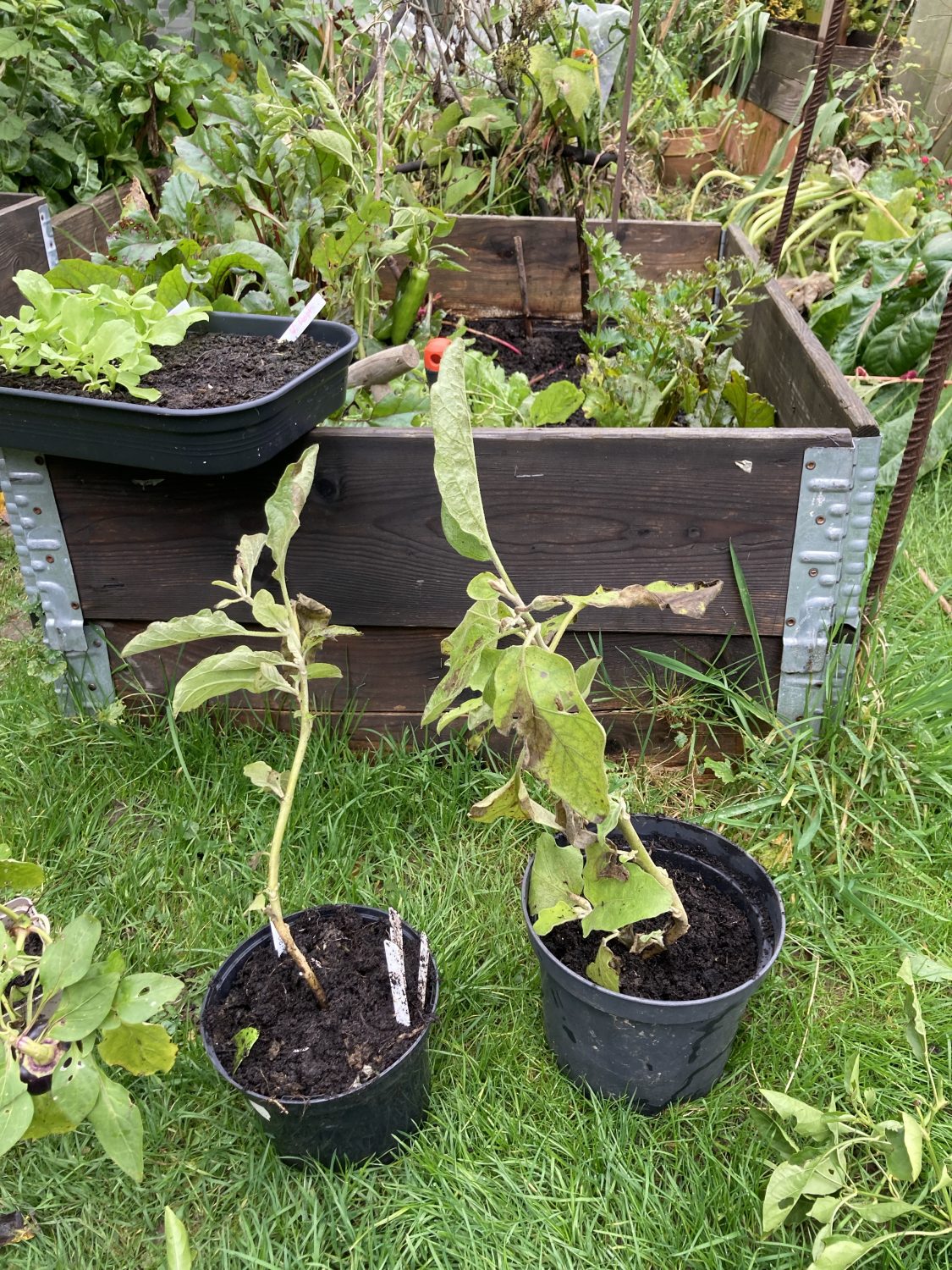 Apropos freies Plätzchen im Hochbeet: In diesem verregneten Sommer sind an vielen Auberginen und Chili Pflanzen keine Früchte gewachsen. Frustig, habe ich doch seltenes und teures Saatgut „verbraten“, welches leider auch schwer wieder zu beschaffen ist. Deshalb grabe ich viele der Pflanzen aus, topfe sie ein und mache sie nackig. Stark zurück geschnitten kommen sie in ein kühles, aber frostfreies Winterquartier. Chili und Pepino habe ich so bereits erfolgreich überwintert. Mit Auberginen versuche ich es in diesem Jahr zum ersten Mal, mit ungewissem Ausgang.