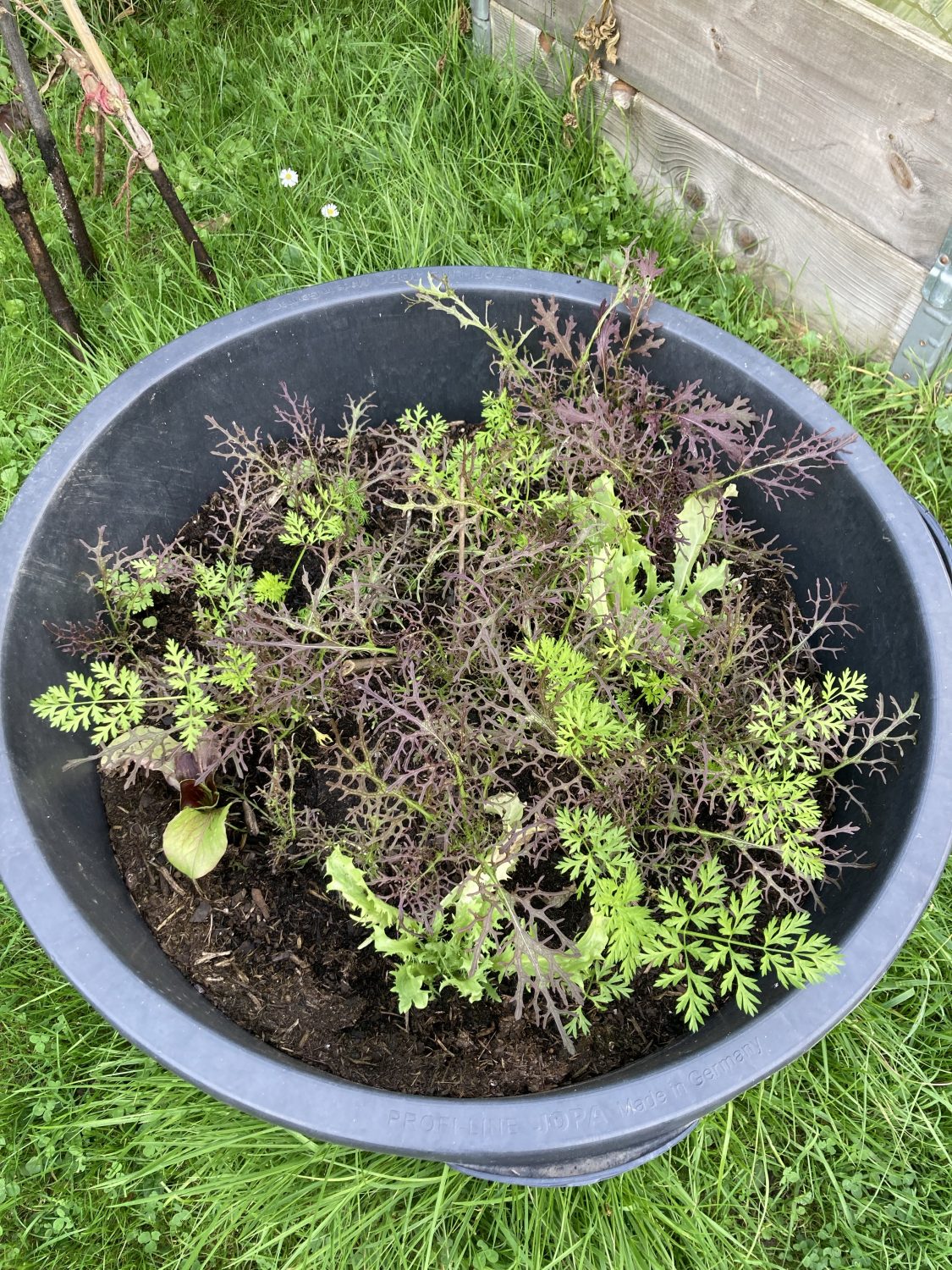 Zurück zu den Salaten: Ich verlasse mich nicht nur auf die eigene Aussaat. Denn eine Aussaat kann auch mal nicht anwachsen. Damit ich auch wirklich was ernten kann im Winter, hole ich mir zusätzlich Setzlinge im Erdballen. Vorzugsweise in örtlichen Gärtnereien. Dort zahle ich für einen Setzling rund 20 Cent, eingewickelt in altes Zeitungspapier. Regional, günstig und Plastik frei. Die habe ich diesmal in große Baukübel gepflanzt. Hier ist das Gemüse sicher vor Nacktschnecken und Wühlmause. Unbedingt Löcher in die Baukübel bohren, damit das Regenwasser ablaufen kann und die Pflanzen nicht „absaufen“.