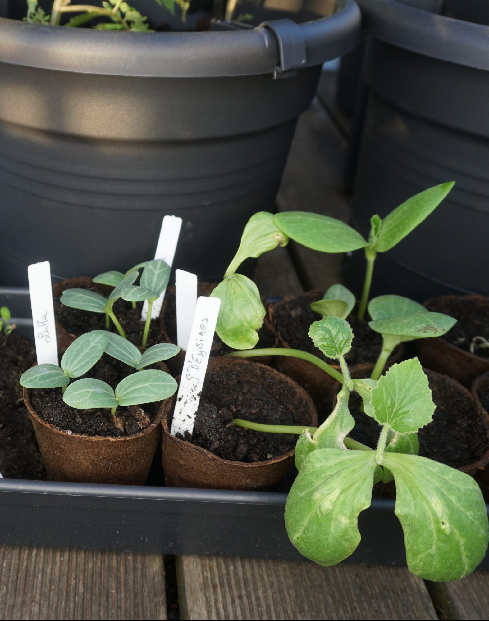 Übrigens: Die Töpfchen aus gepressten Fasern verwende ich nicht mehr (auch wenn sie hier auf den Fotos zu sehen sind). Die sind viel zu fest für das Wurzelwerk aller Kürbisgewächse. Selbst Erbsen verkümmern darin, wenn sie in den Töpfchen ins Gemüsebeet gepflanzt werden. Die Wurzeln können die Töpfchen nicht durchbohren, der Setzling verhungert. Wenn ihr diese Töpfchen verwendet, sie vor dem Auspflanzen zumindest gut einreißen.