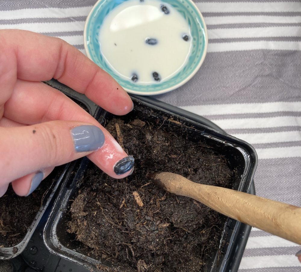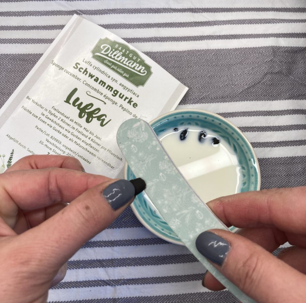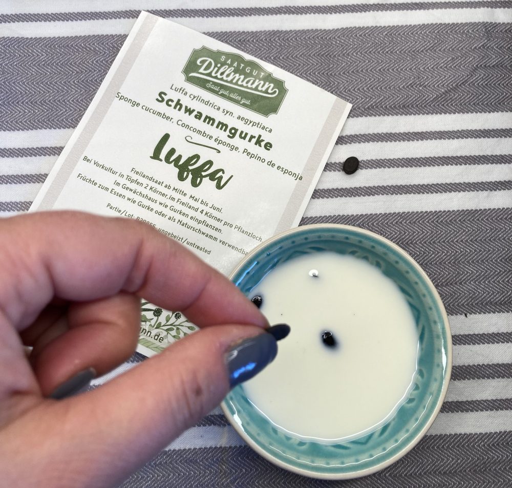 Mitte März geht es wieder los. Inzwischen schaffe ich die Luffa Samen zum keimen zu bringen. Ein wenig Unterstützung mit der Nagelfeile und ein Milchbad. Das runde Ende der Samen vorsichtig angefeilen, so kommt der Keim besser aus der Schale. Das Milchbad unterdrückt die schädliche Keime und weicht die Schale auf. Alternativ kann auch Kamillentee verwendet werden. Maximaler Aufenthalt im Milchbad sind 12 Stunden.