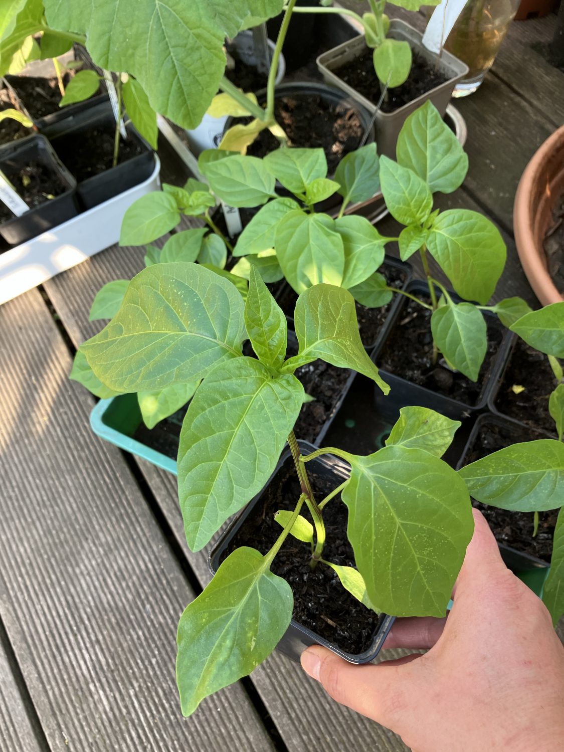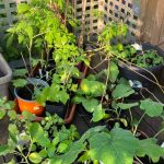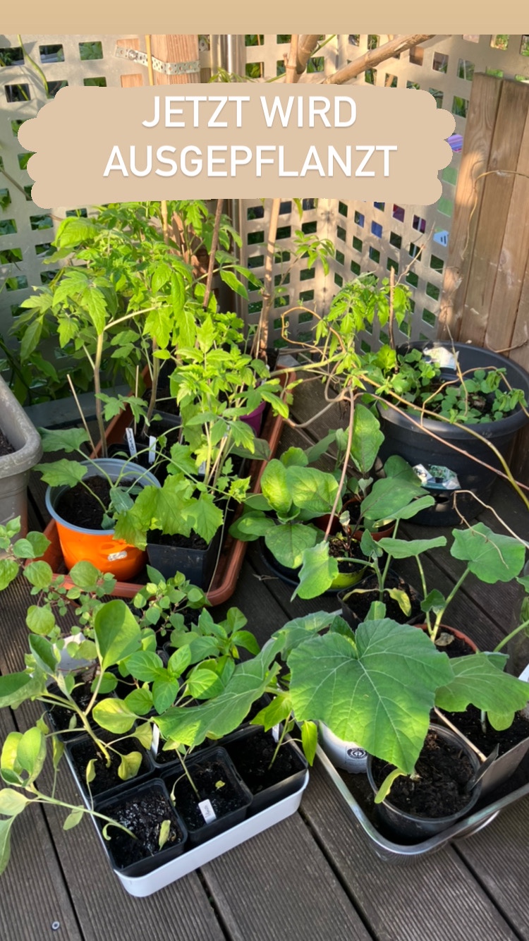 Auch die Pflanztöpfe werden mit frischer Erde aufgefüllt. Dazu noch eine Portion Dünger. Dann wird gepflanzt. Je nach Größe und späterer Standort der Pflanztöpfe kommen 1 – 2 Starkzehrer hinein. Also Paprika, Tomate oder Aubergine. Dazu oft eine Tomatillo oder Stangensellerie. Manchmal auch eine Blattkohlpflanze. Shiso mogelt sich immer mit rein. So füllen sich Balkon und Terrasse, der Platz wird auch hier richtig knapp.