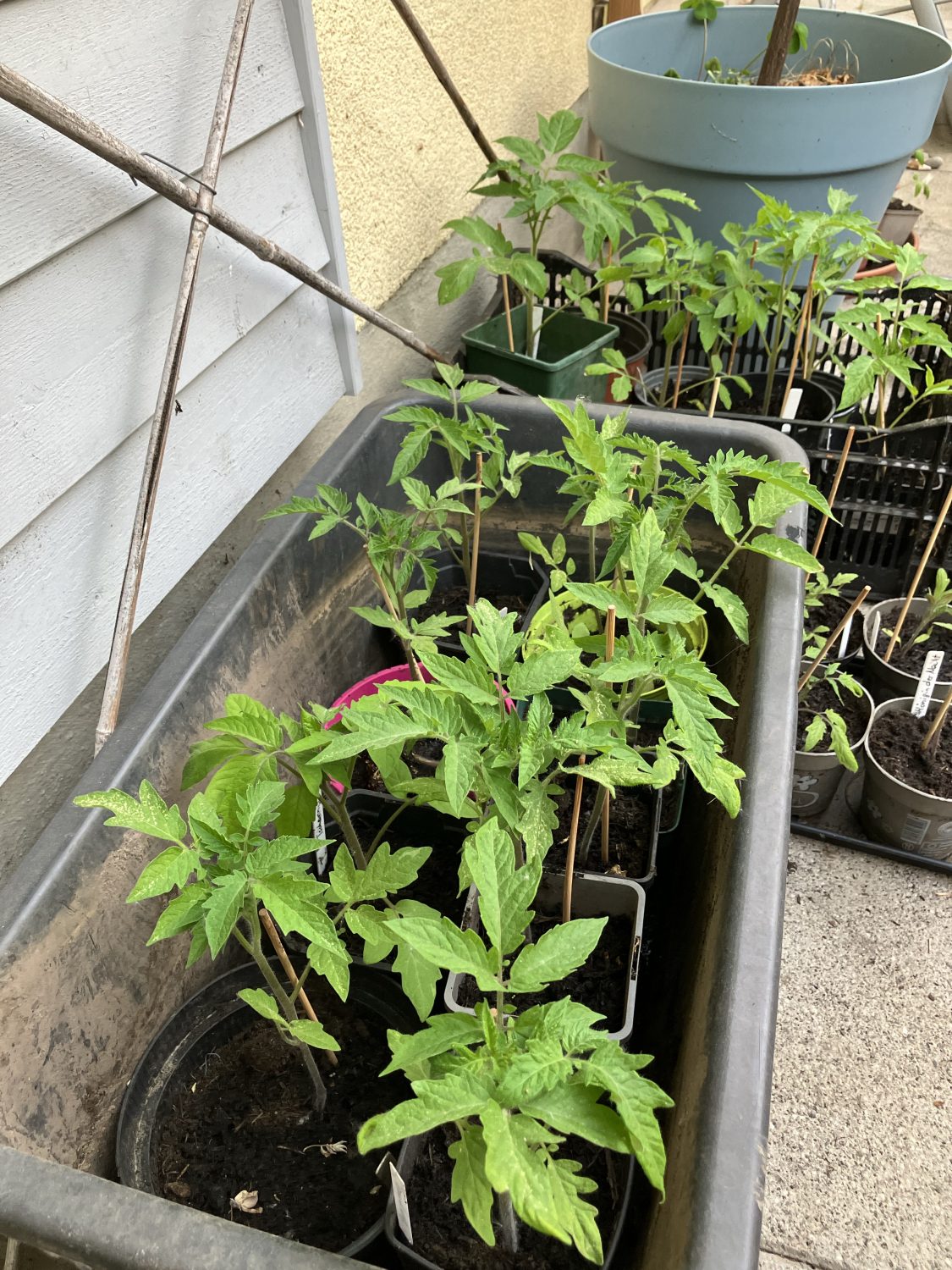 Nachtrag: Heute, am 22. Mai, sitzt rund die Hälfte der Tomaten in Kübeln und unter dem Tomatendach. Leider stehen hier immer noch fast 60 Pflanzen, für die ich zwar ein Platz gefunden habe. Aber ich bin jetzt so platt, dass ich mich gerade nicht aufraffen kann, sie zu pflanzen. Dafür lenke ich mich ab mit der weiteren Aussaat von Petersilie, Eiskraut, Okra, Beete und diversen Salaten.