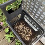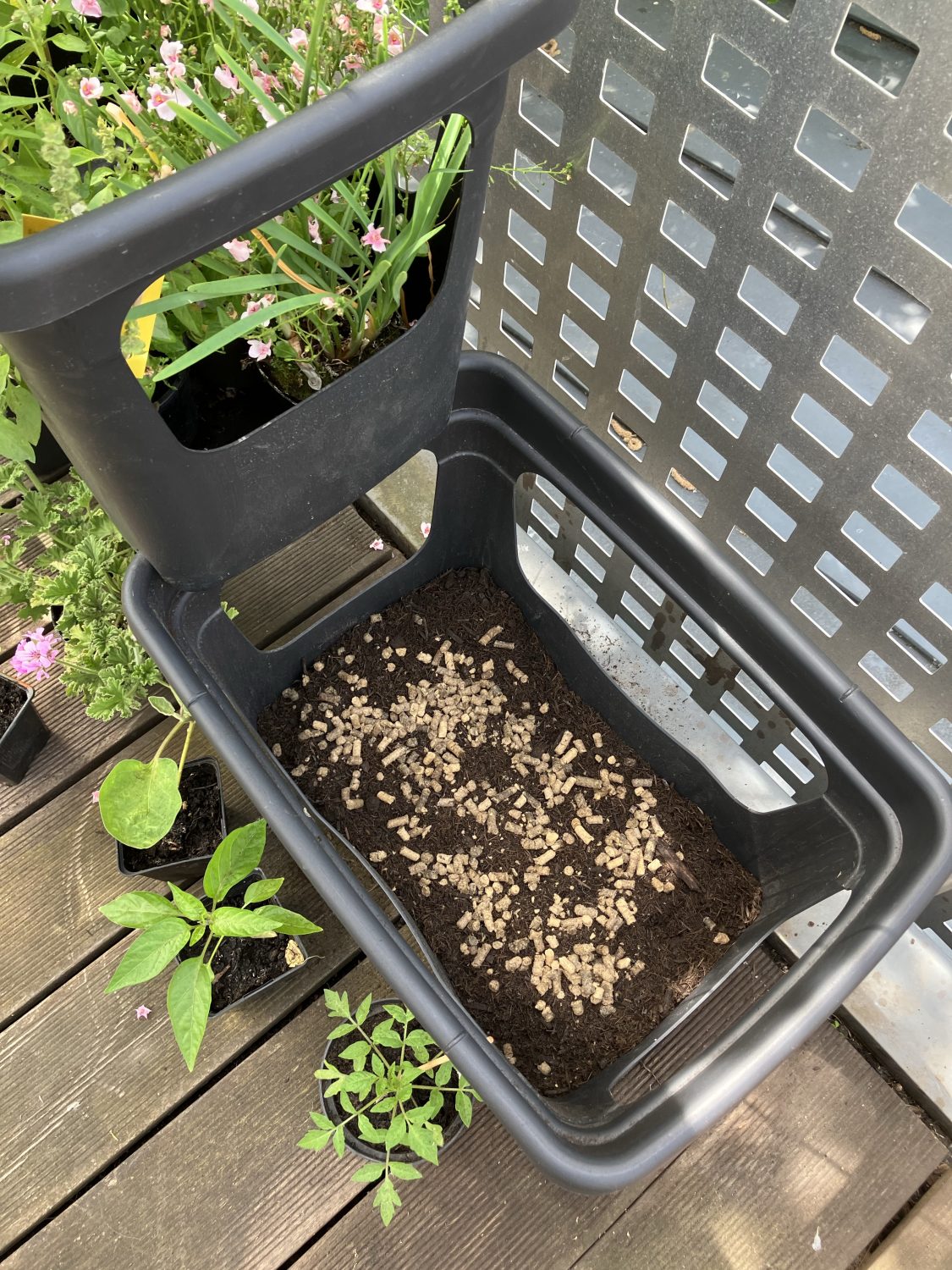 In die drei Etagen fülle ich zuerst ein Gartenerde/ Kompost Gemisch. Dazu eine gute Portion Schafwolle Pellets. Die sind eine leichte Stickstoff Düngung, helfen aber vor allem bei einer guten Wasserversorgung. Die auf gequollenen Pellets speichern länger das Gießwasser – im heißen Balkongarten ein klarer Vorteil.