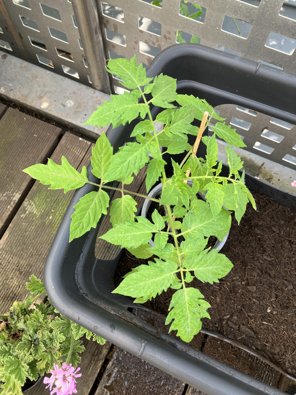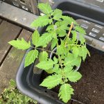In die unterste Etage kommen zuerst zwei Tomaten. Dazwischen eine Zitronenbasilikum und dazwischen habe ich Petersilie ausgesät.