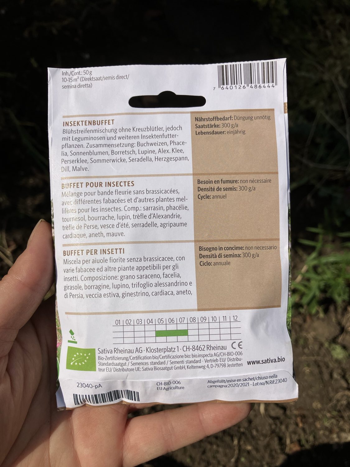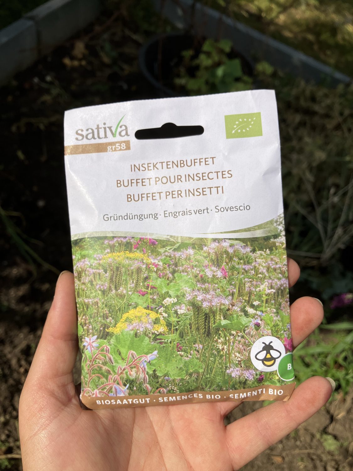In der Mischung von Sativa, welche ich heute ausbringe, sind Samen von Buchweizen, Phacelia, Sonnenblumen, Borretsch, Lupine, Alex. Klee, Perserklee, Sommerwicke, Seradella, Herzgespann, Dill, Malve. Sie bilden eine Insektenweide, welche im nächsten Frühsommer einen reichen Tisch decken wird. Erst vors. Ende Mai, Anfang Juni werden dann die verblühten Pflanzen in die Erde eingearbeitet. Angereichter mit Mikroorganismen wird das ein tolles Beet für Gurken.