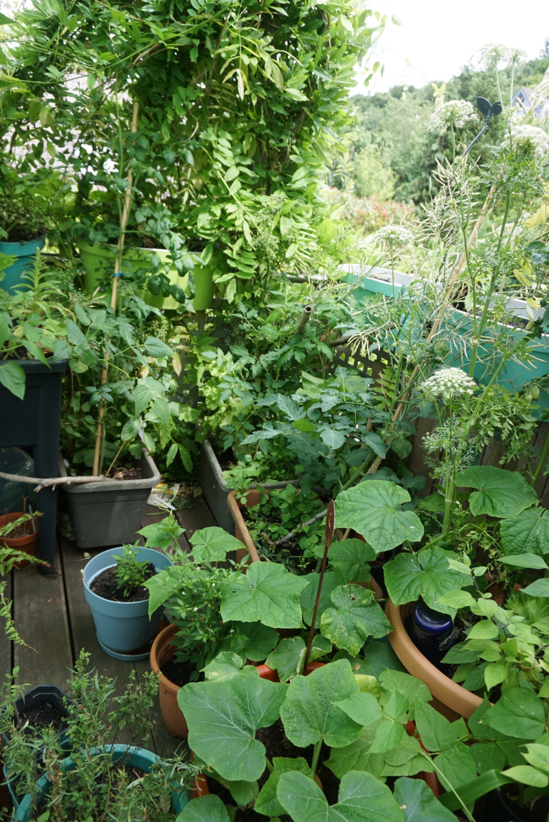 Bei unserem Einzug ins Haus war die Terrasse an der Küche noch vollkommen ohne Schatten. Im Sommer konnte man nicht über die Terrasse gehen, die Füße brannten. Hier kann keine Topfpflanze überleben. Inzwischen ist die Terrasse von drei Seiten abgeschattet durch einen wuchernden Blauregen, dem Bambus und einer schnell wachsenden Weide. Nur im Westen ist kein Schatten. Hier trocknen denn auch regelmäßig die Töpfe innerhalb von Stunden aus.