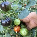 Auch aus Zeitmangel habe ich die meisten Tomaten Pflanzen nicht hoch gebunden oder gar ausgegeizt. Nur den schlimmsten Wildwuchs dämme ich ein. Die Tomaten Pflanzen liegen wie in Italien oder China einfach auf der Erde. Tomaten sind eigentlich kriechende Büsche. Sie werden bei uns vor allem wegen der drohenden Bodenfeuchte – haha – und der damit einher gehenden Braunfäule hoch gebunden. Sicherlich auch weil es ordentlicher aussieht. Beides für mich bzw. hier kein Thema, im Gewächshaus ist das nicht nötig. Die Tomaten gedeihen prächtig. Sie haben auch weniger Sonnenbrand. Ich muss nur aufpassen, dass ich sie nicht zertrete.