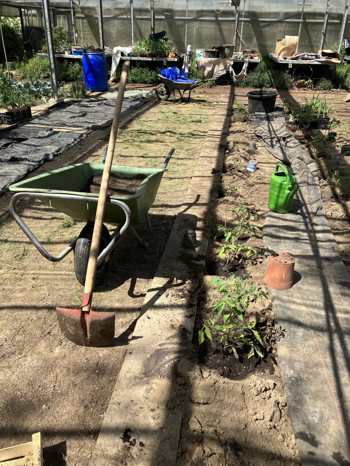 Der Wassermangel ist aktuell auch der Grund, warum hier nur Tomaten sitzen. Eigentlich waren von mir auch Kürbis, Auberginen, Paprika und Gurken im Gewächshaus eingeplant. Doch die wären hier verdurstet. Die wachsen jetzt weiterhin im Hausgarten.