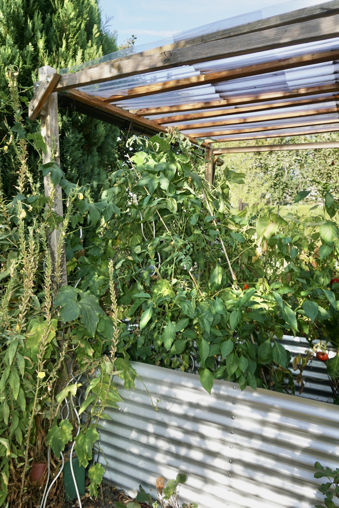 Nicht eine – gleich zwei Luffa Gürkchen haben sich entwickelt. Jubel! Jubel! Da hängen doch tatsächlich versteckt unter all den Blättern Luffa Früchte. Noch nicht länger als 20 cm. Doch der Anfang ist getan, sie wachsen! Ab da geht es schnell! Bereits in zwei Wochen werden sie groß genug sein, damit sich in ihnen das Gerüst der Luffa Schwämme bildet. Nur die Temperaturen sollten jetzt doch noch warm genug bleiben. Jubel! Dabei hatte ich schon alle Hoffnung fahren lassen, befürchtete bei meiner diesjährigen Challenge versagt zu haben. Eines kann ich jetzt schon sagen: Die geschützte Pflanzung in das Hochbeet unter dem Schutzdach ist die Variante, welche funktioniert.